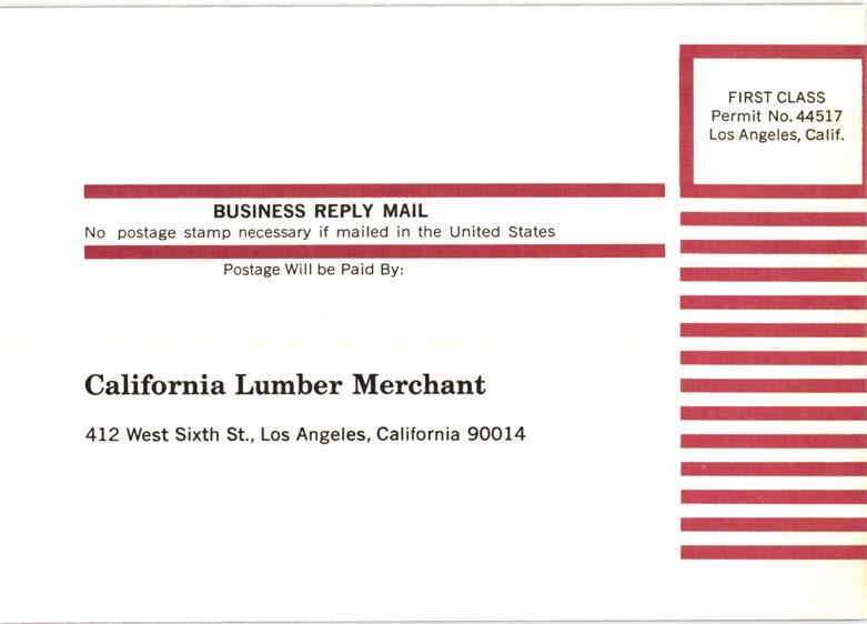 Change of Address-Send subscrip- tion orders and address changes to Circulation Department, California Lumber Merchant. 412 west Sixth St.. Los Anseles, CaIif. 90014. Inelude addre;ss label from recent issue if pgssible, plus lew address, zone numDer or zrp cooe.