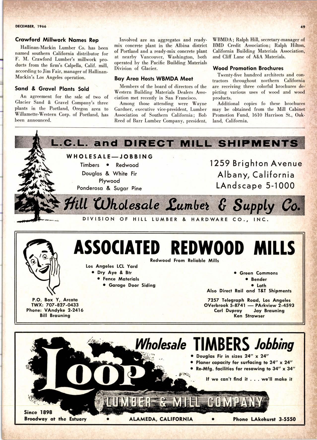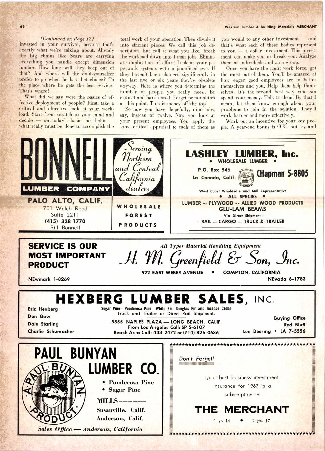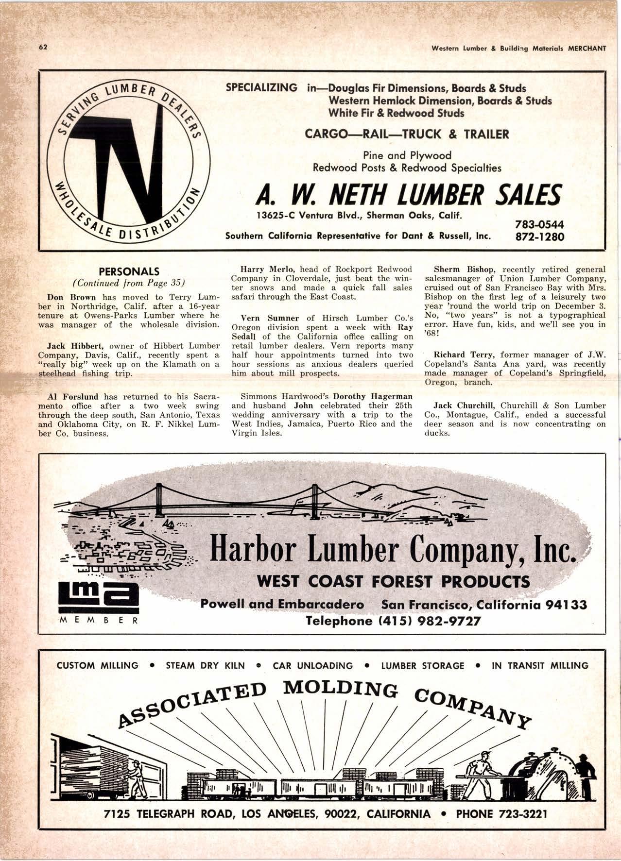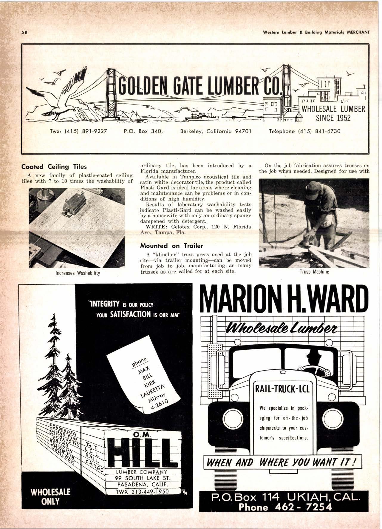 Holl Co., Jomes L. -....--SUtter l-7520 Koppers Co., Inc. ------KJkon 6-2660 lvlcCormick & Borler --.YUkon 2-4033 Wendling-Nothon Co. -----.---.-..-.....--SUtter l-5353 Woodsidc [umber Co. .-.-.-------------Dlomond 3-5644 SPECIAI SENVICES Gilbreoth Chemicol Co. -.-.-------...--.-.-..-SUller l-7537 Redwood Inspeclion Service .---.--..--EXbrook 2-7880 Willis-Moore Poinf Speciollies ..--..--..l\{lssion 8-3200 BAY AREA I.U'\ABER AND IUTIASEN PRODUCIS Alkinson-Slulz Co. .-.-----..-.--------.--..--.--------.345-l 62 I Bof dFBeocom lumber Co. -------.---.-..---..(41 51 527 -31 1 | Bonnell Lumber Co. ---..--...----...-..-..Dlomond 2-1451 Bonnington lurnber Co. -..-.-..--...-.-.--Otympic 8-2881 Colifornio Plywood Corp. --------------.---Olympio 2-5153 Cofif. Sugor & Weslern Pine ....--.--Dlomond 2-1178 Donl Foresl Producls, Inc. --------..-.-(,1 | 51 322-l 8,ll Evons Producls Co. ----.----------------.----.---...-533-8866 Gcorgio-Pocific Corp. .-----------------...--..-.-----849-0561 Gcorgio-Pocific Corp. (Son Josc)...-...CYpress 7-78OO Golden Gote Lumber Co. -..--.-..--...THornwoll l-4730 Higgins tumber Co. (Son Josc) .-.----.CHcrry 3-3120 Hill Whsle. [umber & Supply Co.----l.Andscope 5-1000 Holmes, Fred C. ..--------.....-------.------..--KEllog 3-5326 K-D Ccdor Supply Co. ---ELgin 7-1063 Kilgore, Robed P.-.--..--..---------------Glenwood 6-0831 Loop lumber & lrtill Co.------------..[Alchurrt 3-5550 MocBeolh Hordwood Co.--------.-.---THornwsll 3-1390 Pocific Fir Soles ..-----------.--.---.---------DAvenport 6-8864 Pecrfcss lumbcr Co..---------.----------tOckhavcn 2-77@ Sownill Sofor Co. -------*--6117&1 Silnorco, Inc. __.._.453-6620 Slondord Lumber Co., lnc. ---.-------lAndscope 6-6356 Stroble lumber Cornpony------------TEnplcbor 2-5584 Rolf Slolcrcn --------DAvcnporl 7-7171 Torter, Websler & Johnson .-------------SYcomorc 7-2351 Trionglc Lumber Co.-...-........--.--..-.".LAndscope 4-9595 Twin Horbors Soler Co. ..--..-.-..-.-.......(41 5t 327-1380 U.S. Plyrood Corp. (Ooklondl -----..TWinoolr 3-554.1 U.S. Plywood Corp. (Sonto Clorol -..-..€Hcrry 3-5286 Wesfern Pinc Supply Co.-.-----.----...---OLympic 3-771 | While Brolhers .----....-ANdovcr l-160O Woodside Lumber Co..-.-----------..-..-Dlomond 3-56{4 PANETS_DOORs-SASH_SCNEENS ,l^tttwoRK-ButtDt NG rl^AtERlAtS Arlerio Door Co., Inc, (Son Joccl.-.-.-----...Gt 6-4098 Cofoveros Ccmenl Co.-----..-------...-..-G[cncourt l -710o Torler, Webster & Johnson--.-.--------SYcomorc l-2351 SPECIAT SERV]CES Colif. Lumber lnspeclion Svc.----(408) CYpress 7-8071 Choflenge Cook Bros.-.------ ----562-0120 Kvof heim Mochinery Co. ..---.---.-.----.. -----VOn 7 62-1363 Western Dry Kiln----....-.... --.,---521-3400 Ziel & Co. -,---,.-------.----Yukon l-021O SACRAMENTO AREA turlBEt Cof-Ssc lumber Solg, Inc. -----..-.-.---..(9161 187-7817 Copitof Plywood, Inc.......-.-.-.-.---.---.-----.-.(91 6) 922-8861 Evons Producls Co. .-.--..-..-------.-..-.-----.--...,166{52+ Higgins Lumber Co., J. E. .---927-27Xf King's River Lumbar Corp. ------.--.-.----.(9161 155-Z.249 Nikkef lumber Co., R. F. ---.-----.-..-.-.-..lVonhoc 7{l/5 Norrh Vollcy lumbcr Solcr --.--------.-.--(9161 9Z712Ol Plocerville Lurnbcr Co, ---.-----.-------.NAtionol 2-33E5 BUITDING I'TATERIAIS Coloveros Cerncnt Co. Gllbcrt 2-899f Gcorgio-Pocific Worchourc .-..--.--.---.-WAborh 2-9631 Unifed Stolcs Ply*ood Corp. --.----.Gtodrtonc l-2891 Weyerhoeuser Compony --------------------FRontier l-l0OO SPECIAT SERVICES Lodi-fob Induslrics ..--(2131 368-532,1 RENO, NEVADA, AREA Copitol Pf ywood, I nc.---.--------- - - - ----.---17021 329 -119I Donl Foresl Producls. Inc. ------.-----..-..-.-...323-,13/t5 Feolhcr River Lumber Co. ----329-1201 U.S. Plywood Corp. ---.----.-.-..-----.---.-------.-358-8E55 WHOLESATE LUMBER SPECIAI'ZING 'N TRUCK AND TRA'TIR SHIPTENrS FR.OT ORTGOfl AND IIO. CAUTORN/,A GLUE LAMINATED BEAMS and ARCHES Selling to Retail Lumber Dealers Exclusively Wholesale Distributors of Forest Products Since l9O4 ! t I It Ir t CALIFORNA SUGAR & WESTER]\ PII\B AGENCY, INC. ltrEl M:fVr=rECf P. O. Box 153 BURLINGAME, CALIFORNIA (4fS) Dlamond 24178