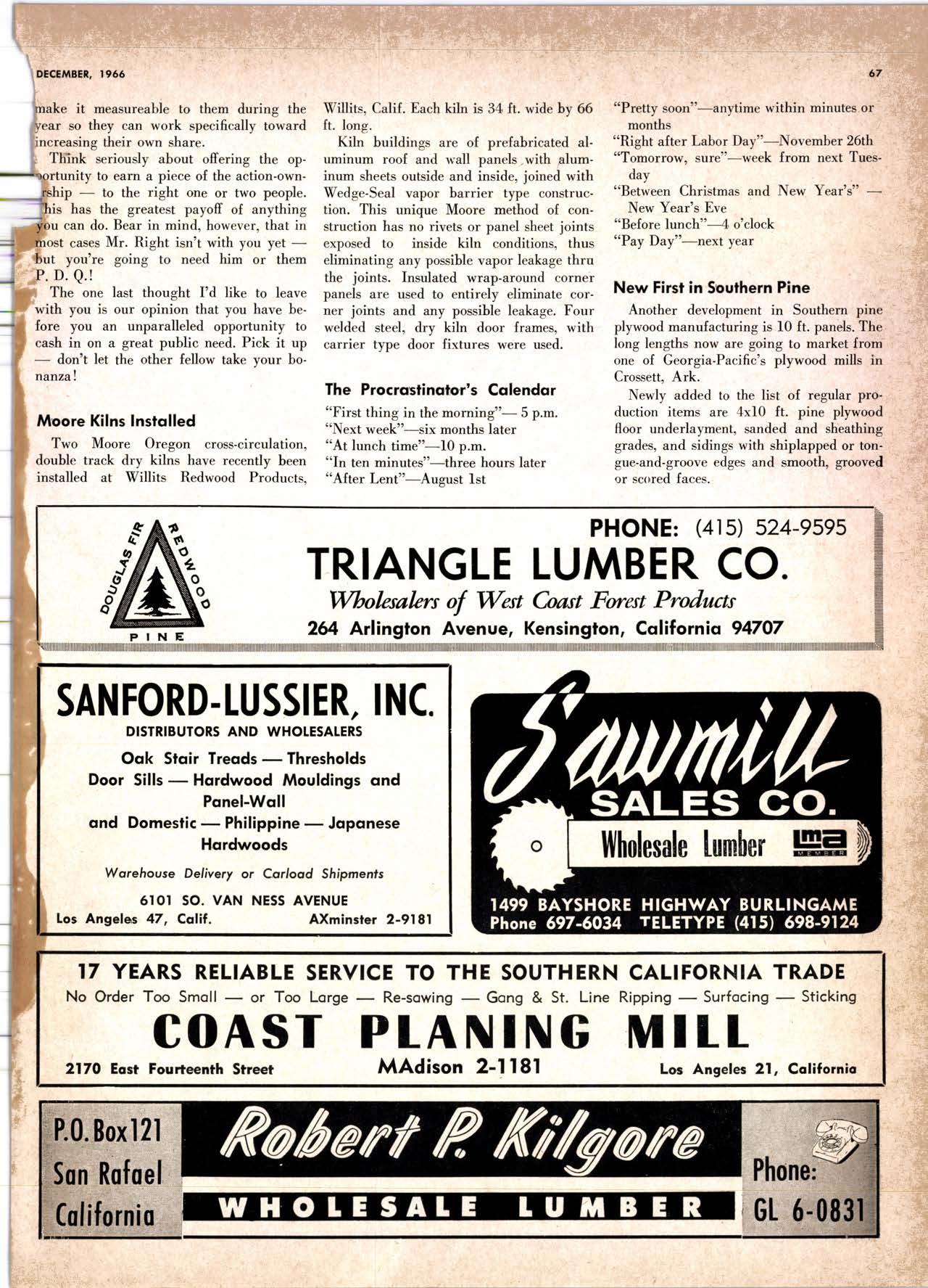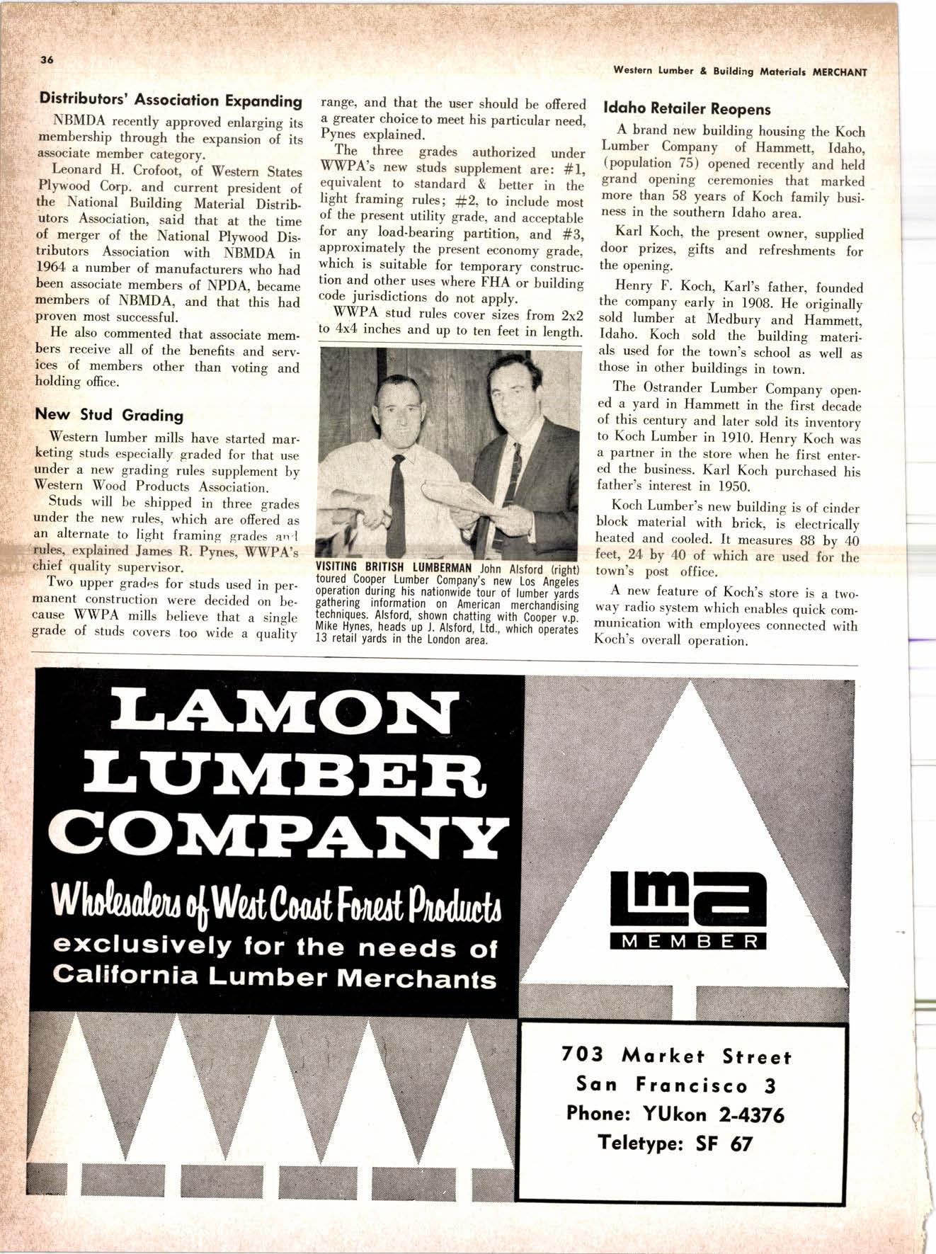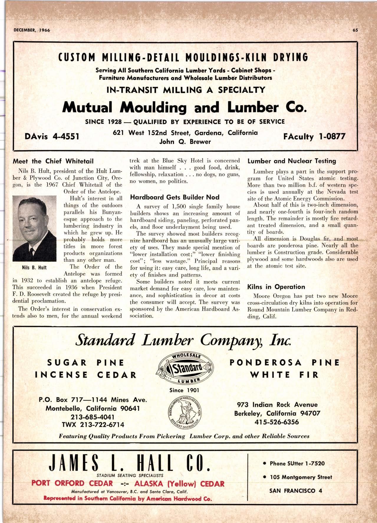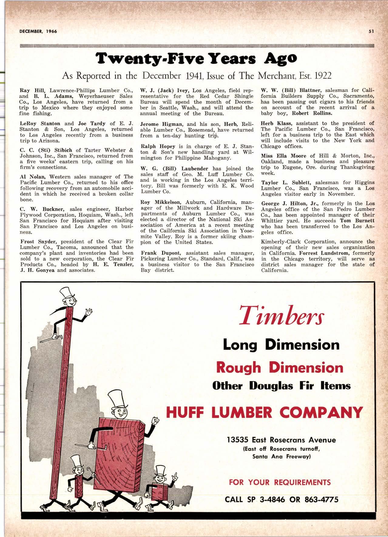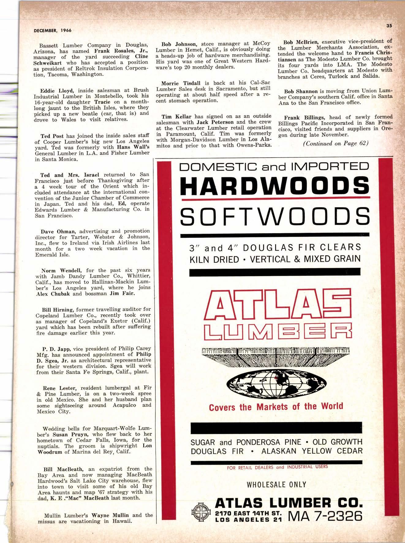 Holl Co., Jomes L. -....--SUtter l-7520 Koppers Co., Inc. ------KJkon 6-2660 lvlcCormick & Borler --.YUkon 2-4033 Wendling-Nothon Co. -----.---.-..-.....--SUtter l-5353 Woodsidc [umber Co. .-.-.-------------Dlomond 3-5644 SPECIAI SENVICES Gilbreoth Chemicol Co. -.-.-------...--.-.-..-SUller l-7537 Redwood Inspeclion Service .---.--..--EXbrook 2-7880 Willis-Moore Poinf Speciollies ..--..--..l\{lssion 8-3200 BAY AREA I.U'\ABER AND IUTIASEN PRODUCIS Alkinson-Slulz Co. .-.-----..-.--------.--..--.--------.345-l 62 I Bof dFBeocom lumber Co. -------.---.-..---..(41 51 527 -31 1 | Bonnell Lumber Co. ---..--...----...-..-..Dlomond 2-1451 Bonnington lurnber Co. -..-.-..--...-.-.--Otympic 8-2881 Colifornio Plywood Corp. --------------.---Olympio 2-5153 Cofif. Sugor & Weslern Pine ....--.--Dlomond 2-1178 Donl Foresl Producls, Inc. --------..-.-(,1 | 51 322-l 8,ll Evons Producls Co. ----.----------------.----.---...-533-8866 Gcorgio-Pocific Corp. .-----------------...--..-.-----849-0561 Gcorgio-Pocific Corp. (Son Josc)...-...CYpress 7-78OO Golden Gote Lumber Co. -..--.-..--...THornwoll l-4730 Higgins tumber Co. (Son Josc) .-.----.CHcrry 3-3120 Hill Whsle. [umber & Supply Co.----l.Andscope 5-1000 Holmes, Fred C. ..--------.....-------.------..--KEllog 3-5326 K-D Ccdor Supply Co. ---ELgin 7-1063 Kilgore, Robed P.-.--..--..---------------Glenwood 6-0831 Loop lumber & lrtill Co.------------..[Alchurrt 3-5550 MocBeolh Hordwood Co.--------.-.---THornwsll 3-1390 Pocific Fir Soles ..-----------.--.---.---------DAvenport 6-8864 Pecrfcss lumbcr Co..---------.----------tOckhavcn 2-77@ Sownill Sofor Co. -------*--6117&1 Silnorco, Inc. __.._.453-6620 Slondord Lumber Co., lnc. ---.-------lAndscope 6-6356 Stroble lumber Cornpony------------TEnplcbor 2-5584 Rolf Slolcrcn --------DAvcnporl 7-7171 Torter, Websler & Johnson .-------------SYcomorc 7-2351 Trionglc Lumber Co.-...-........--.--..-.".LAndscope 4-9595 Twin Horbors Soler Co. ..--..-.-..-.-.......(41 5t 327-1380 U.S. Plyrood Corp. (Ooklondl -----..TWinoolr 3-554.1 U.S. Plywood Corp. (Sonto Clorol -..-..€Hcrry 3-5286 Wesfern Pinc Supply Co.-.-----.----...---OLympic 3-771 | While Brolhers .----....-ANdovcr l-160O Woodside Lumber Co..-.-----------..-..-Dlomond 3-56{4 PANETS_DOORs-SASH_SCNEENS ,l^tttwoRK-ButtDt NG rl^AtERlAtS Arlerio Door Co., Inc, (Son Joccl.-.-.-----...Gt 6-4098 Cofoveros Ccmenl Co.-----..-------...-..-G[cncourt l -710o Torler, Webster & Johnson--.-.--------SYcomorc l-2351 SPECIAT SERV]CES Colif. Lumber lnspeclion Svc.----(408) CYpress 7-8071 Choflenge Cook Bros.-.------ ----562-0120 Kvof heim Mochinery Co. ..---.---.-.----.. -----VOn 7 62-1363 Western Dry Kiln----....-.... --.,---521-3400 Ziel & Co. -,---,.-------.----Yukon l-021O SACRAMENTO AREA turlBEt Cof-Ssc lumber Solg, Inc. -----..-.-.---..(9161 187-7817 Copitof Plywood, Inc.......-.-.-.-.---.---.-----.-.(91 6) 922-8861 Evons Producls Co. .-.--..-..-------.-..-.-----.--...,166{52+ Higgins Lumber Co., J. E. .---927-27Xf King's River Lumbar Corp. ------.--.-.----.(9161 155-Z.249 Nikkef lumber Co., R. F. ---.-----.-..-.-.-..lVonhoc 7{l/5 Norrh Vollcy lumbcr Solcr --.--------.-.--(9161 9Z712Ol Plocerville Lurnbcr Co, ---.-----.-------.NAtionol 2-33E5 BUITDING I'TATERIAIS Coloveros Cerncnt Co. Gllbcrt 2-899f Gcorgio-Pocific Worchourc .-..--.--.---.-WAborh 2-9631 Unifed Stolcs Ply*ood Corp. --.----.Gtodrtonc l-2891 Weyerhoeuser Compony --------------------FRontier l-l0OO SPECIAT SERVICES Lodi-fob Induslrics ..--(2131 368-532,1 RENO, NEVADA, AREA Copitol Pf ywood, I nc.---.--------- - - - ----.---17021 329 -119I Donl Foresl Producls. Inc. ------.-----..-..-.-...323-,13/t5 Feolhcr River Lumber Co. ----329-1201 U.S. Plywood Corp. ---.----.-.-..-----.---.-------.-358-8E55 WHOLESATE LUMBER SPECIAI'ZING 'N TRUCK AND TRA'TIR SHIPTENrS FR.OT ORTGOfl AND IIO. CAUTORN/,A GLUE LAMINATED BEAMS and ARCHES Selling to Retail Lumber Dealers Exclusively Wholesale Distributors of Forest Products Since l9O4 ! t I It Ir t CALIFORNA SUGAR & WESTER]\ PII\B AGENCY, INC. ltrEl M:fVr=rECf P. O. Box 153 BURLINGAME, CALIFORNIA (4fS) Dlamond 24178
