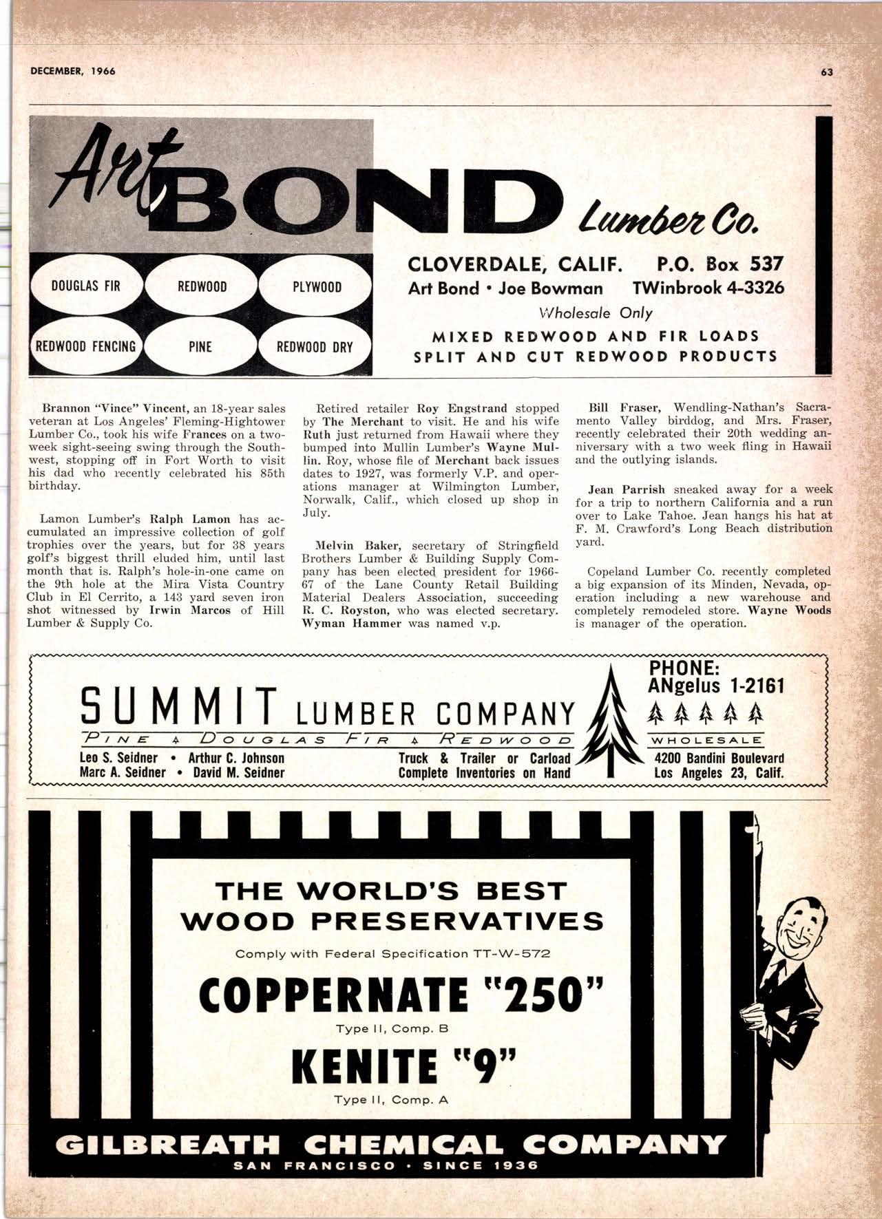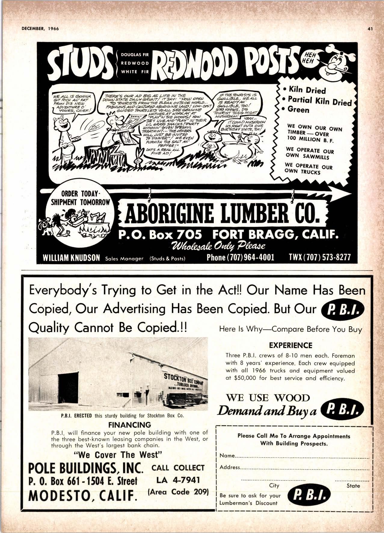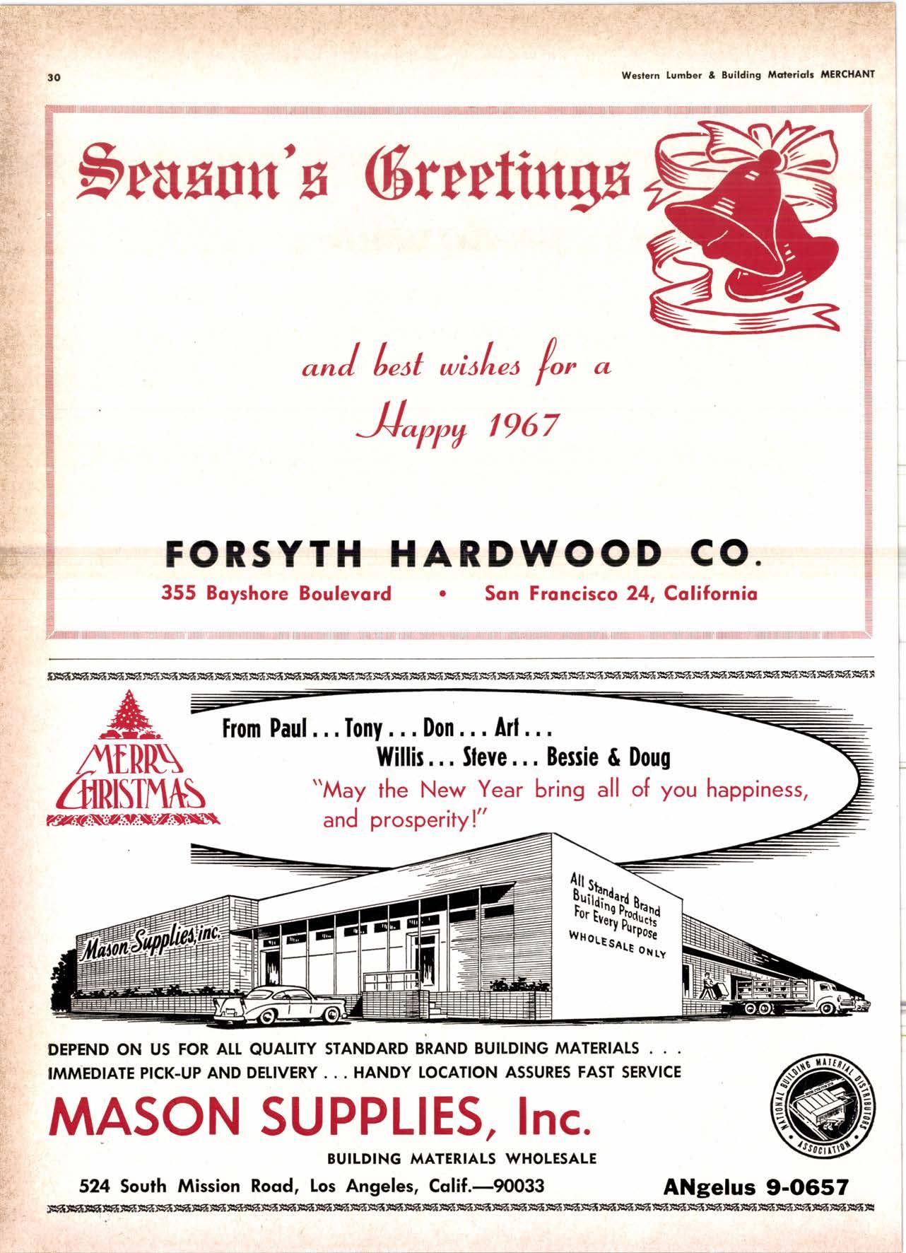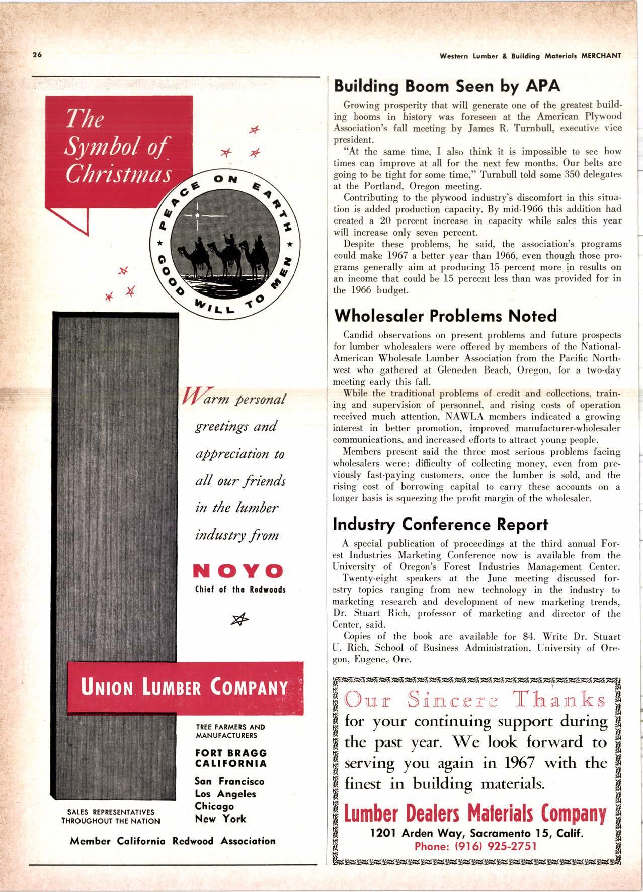 Holl Co., Jomes L. -....--SUtter l-7520 Koppers Co., Inc. ------KJkon 6-2660 lvlcCormick & Borler --.YUkon 2-4033 Wendling-Nothon Co. -----.---.-..-.....--SUtter l-5353 Woodsidc [umber Co. .-.-.-------------Dlomond 3-5644 SPECIAI SENVICES Gilbreoth Chemicol Co. -.-.-------...--.-.-..-SUller l-7537 Redwood Inspeclion Service .---.--..--EXbrook 2-7880 Willis-Moore Poinf Speciollies ..--..--..l\{lssion 8-3200 BAY AREA I.U'\ABER AND IUTIASEN PRODUCIS Alkinson-Slulz Co. .-.-----..-.--------.--..--.--------.345-l 62 I Bof dFBeocom lumber Co. -------.---.-..---..(41 51 527 -31 1 | Bonnell Lumber Co. ---..--...----...-..-..Dlomond 2-1451 Bonnington lurnber Co. -..-.-..--...-.-.--Otympic 8-2881 Colifornio Plywood Corp. --------------.---Olympio 2-5153 Cofif. Sugor & Weslern Pine ....--.--Dlomond 2-1178 Donl Foresl Producls, Inc. --------..-.-(,1 | 51 322-l 8,ll Evons Producls Co. ----.----------------.----.---...-533-8866 Gcorgio-Pocific Corp. .-----------------...--..-.-----849-0561 Gcorgio-Pocific Corp. (Son Josc)...-...CYpress 7-78OO Golden Gote Lumber Co. -..--.-..--...THornwoll l-4730 Higgins tumber Co. (Son Josc) .-.----.CHcrry 3-3120 Hill Whsle. [umber & Supply Co.----l.Andscope 5-1000 Holmes, Fred C. ..--------.....-------.------..--KEllog 3-5326 K-D Ccdor Supply Co. ---ELgin 7-1063 Kilgore, Robed P.-.--..--..---------------Glenwood 6-0831 Loop lumber & lrtill Co.------------..[Alchurrt 3-5550 MocBeolh Hordwood Co.--------.-.---THornwsll 3-1390 Pocific Fir Soles ..-----------.--.---.---------DAvenport 6-8864 Pecrfcss lumbcr Co..---------.----------tOckhavcn 2-77@ Sownill Sofor Co. -------*--6117&1 Silnorco, Inc. __.._.453-6620 Slondord Lumber Co., lnc. ---.-------lAndscope 6-6356 Stroble lumber Cornpony------------TEnplcbor 2-5584 Rolf Slolcrcn --------DAvcnporl 7-7171 Torter, Websler & Johnson .-------------SYcomorc 7-2351 Trionglc Lumber Co.-...-........--.--..-.".LAndscope 4-9595 Twin Horbors Soler Co. ..--..-.-..-.-.......(41 5t 327-1380 U.S. Plyrood Corp. (Ooklondl -----..TWinoolr 3-554.1 U.S. Plywood Corp. (Sonto Clorol -..-..€Hcrry 3-5286 Wesfern Pinc Supply Co.-.-----.----...---OLympic 3-771 | While Brolhers .----....-ANdovcr l-160O Woodside Lumber Co..-.-----------..-..-Dlomond 3-56{4 PANETS_DOORs-SASH_SCNEENS ,l^tttwoRK-ButtDt NG rl^AtERlAtS Arlerio Door Co., Inc, (Son Joccl.-.-.-----...Gt 6-4098 Cofoveros Ccmenl Co.-----..-------...-..-G[cncourt l -710o Torler, Webster & Johnson--.-.--------SYcomorc l-2351 SPECIAT SERV]CES Colif. Lumber lnspeclion Svc.----(408) CYpress 7-8071 Choflenge Cook Bros.-.------ ----562-0120 Kvof heim Mochinery Co. ..---.---.-.----.. -----VOn 7 62-1363 Western Dry Kiln----....-.... --.,---521-3400 Ziel & Co. -,---,.-------.----Yukon l-021O SACRAMENTO AREA turlBEt Cof-Ssc lumber Solg, Inc. -----..-.-.---..(9161 187-7817 Copitof Plywood, Inc.......-.-.-.-.---.---.-----.-.(91 6) 922-8861 Evons Producls Co. .-.--..-..-------.-..-.-----.--...,166{52+ Higgins Lumber Co., J. E. .---927-27Xf King's River Lumbar Corp. ------.--.-.----.(9161 155-Z.249 Nikkef lumber Co., R. F. ---.-----.-..-.-.-..lVonhoc 7{l/5 Norrh Vollcy lumbcr Solcr --.--------.-.--(9161 9Z712Ol Plocerville Lurnbcr Co, ---.-----.-------.NAtionol 2-33E5 BUITDING I'TATERIAIS Coloveros Cerncnt Co. Gllbcrt 2-899f Gcorgio-Pocific Worchourc .-..--.--.---.-WAborh 2-9631 Unifed Stolcs Ply*ood Corp. --.----.Gtodrtonc l-2891 Weyerhoeuser Compony --------------------FRontier l-l0OO SPECIAT SERVICES Lodi-fob Induslrics ..--(2131 368-532,1 RENO, NEVADA, AREA Copitol Pf ywood, I nc.---.--------- - - - ----.---17021 329 -119I Donl Foresl Producls. Inc. ------.-----..-..-.-...323-,13/t5 Feolhcr River Lumber Co. ----329-1201 U.S. Plywood Corp. ---.----.-.-..-----.---.-------.-358-8E55 WHOLESATE LUMBER SPECIAI'ZING 'N TRUCK AND TRA'TIR SHIPTENrS FR.OT ORTGOfl AND IIO. CAUTORN/,A GLUE LAMINATED BEAMS and ARCHES Selling to Retail Lumber Dealers Exclusively Wholesale Distributors of Forest Products Since l9O4 ! t I It Ir t CALIFORNA SUGAR & WESTER]\ PII\B AGENCY, INC. ltrEl M:fVr=rECf P. O. Box 153 BURLINGAME, CALIFORNIA (4fS) Dlamond 24178