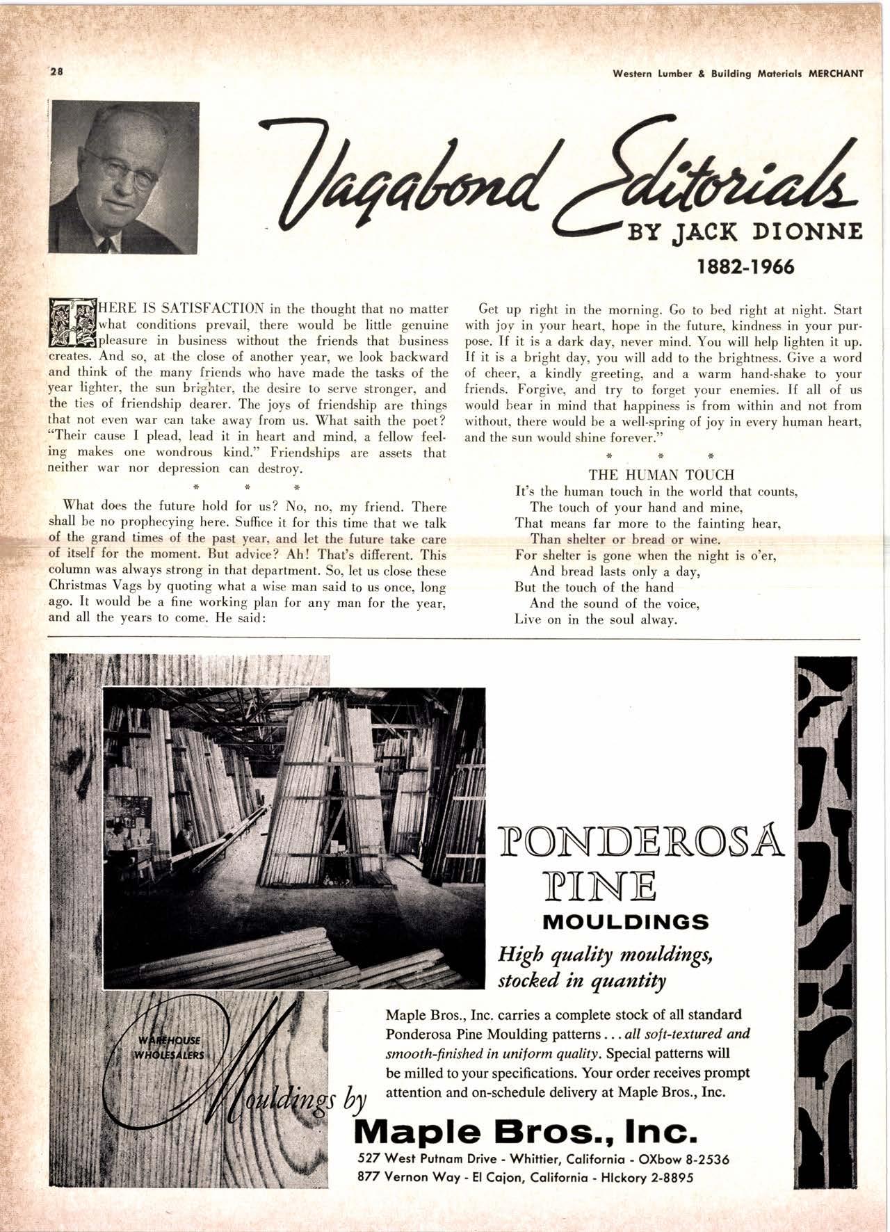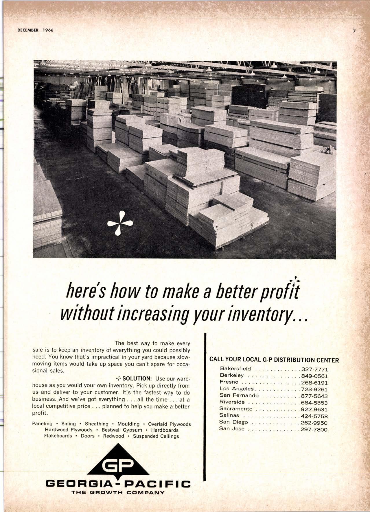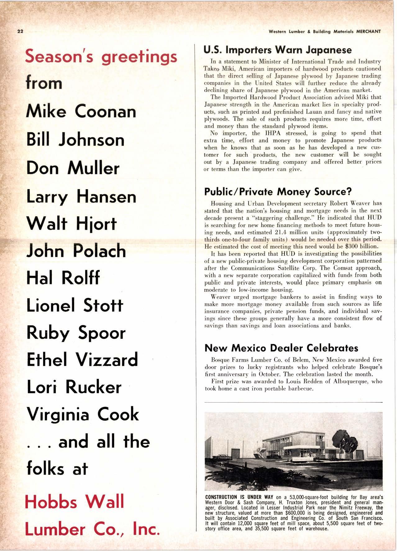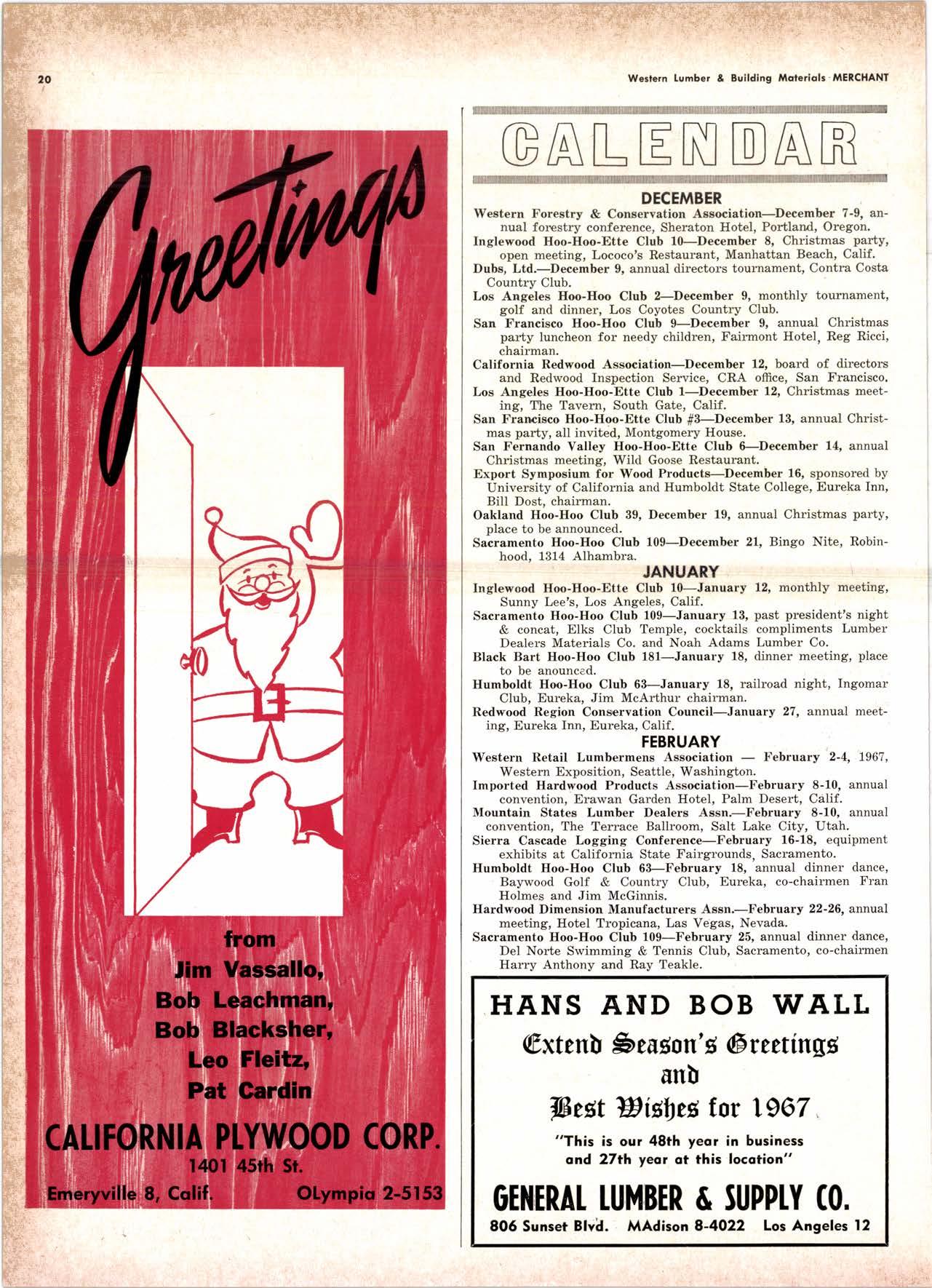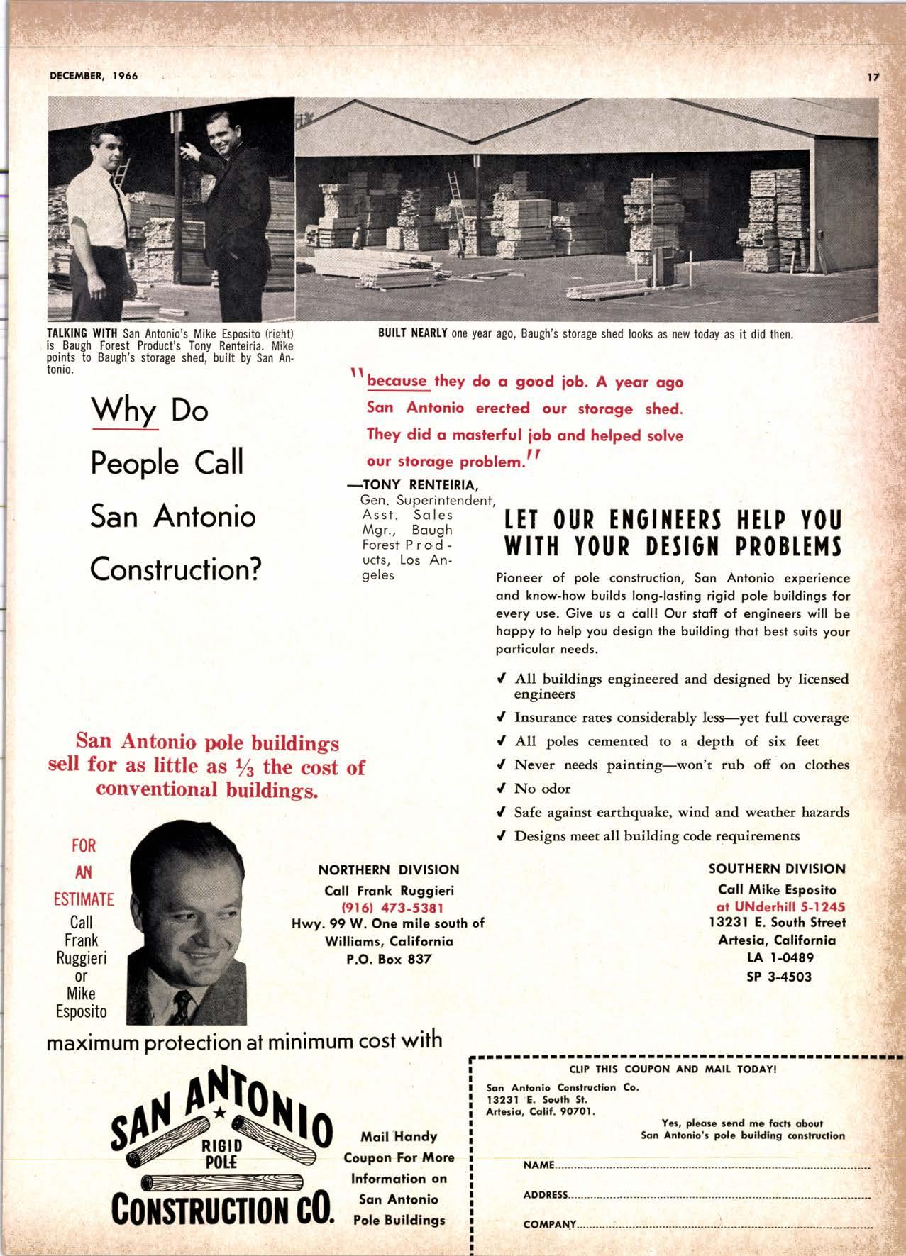 Holl Co., Jomes L. -....--SUtter l-7520 Koppers Co., Inc. ------KJkon 6-2660 lvlcCormick & Borler --.YUkon 2-4033 Wendling-Nothon Co. -----.---.-..-.....--SUtter l-5353 Woodsidc [umber Co. .-.-.-------------Dlomond 3-5644 SPECIAI SENVICES Gilbreoth Chemicol Co. -.-.-------...--.-.-..-SUller l-7537 Redwood Inspeclion Service .---.--..--EXbrook 2-7880 Willis-Moore Poinf Speciollies ..--..--..l\{lssion 8-3200 BAY AREA I.U'\ABER AND IUTIASEN PRODUCIS Alkinson-Slulz Co. .-.-----..-.--------.--..--.--------.345-l 62 I Bof dFBeocom lumber Co. -------.---.-..---..(41 51 527 -31 1 | Bonnell Lumber Co. ---..--...----...-..-..Dlomond 2-1451 Bonnington lurnber Co. -..-.-..--...-.-.--Otympic 8-2881 Colifornio Plywood Corp. --------------.---Olympio 2-5153 Cofif. Sugor & Weslern Pine ....--.--Dlomond 2-1178 Donl Foresl Producls, Inc. --------..-.-(,1 | 51 322-l 8,ll Evons Producls Co. ----.----------------.----.---...-533-8866 Gcorgio-Pocific Corp. .-----------------...--..-.-----849-0561 Gcorgio-Pocific Corp. (Son Josc)...-...CYpress 7-78OO Golden Gote Lumber Co. -..--.-..--...THornwoll l-4730 Higgins tumber Co. (Son Josc) .-.----.CHcrry 3-3120 Hill Whsle. [umber & Supply Co.----l.Andscope 5-1000 Holmes, Fred C. ..--------.....-------.------..--KEllog 3-5326 K-D Ccdor Supply Co. ---ELgin 7-1063 Kilgore, Robed P.-.--..--..---------------Glenwood 6-0831 Loop lumber & lrtill Co.------------..[Alchurrt 3-5550 MocBeolh Hordwood Co.--------.-.---THornwsll 3-1390 Pocific Fir Soles ..-----------.--.---.---------DAvenport 6-8864 Pecrfcss lumbcr Co..---------.----------tOckhavcn 2-77@ Sownill Sofor Co. -------*--6117&1 Silnorco, Inc. __.._.453-6620 Slondord Lumber Co., lnc. ---.-------lAndscope 6-6356 Stroble lumber Cornpony------------TEnplcbor 2-5584 Rolf Slolcrcn --------DAvcnporl 7-7171 Torter, Websler & Johnson .-------------SYcomorc 7-2351 Trionglc Lumber Co.-...-........--.--..-.".LAndscope 4-9595 Twin Horbors Soler Co. ..--..-.-..-.-.......(41 5t 327-1380 U.S. Plyrood Corp. (Ooklondl -----..TWinoolr 3-554.1 U.S. Plywood Corp. (Sonto Clorol -..-..€Hcrry 3-5286 Wesfern Pinc Supply Co.-.-----.----...---OLympic 3-771 | While Brolhers .----....-ANdovcr l-160O Woodside Lumber Co..-.-----------..-..-Dlomond 3-56{4 PANETS_DOORs-SASH_SCNEENS ,l^tttwoRK-ButtDt NG rl^AtERlAtS Arlerio Door Co., Inc, (Son Joccl.-.-.-----...Gt 6-4098 Cofoveros Ccmenl Co.-----..-------...-..-G[cncourt l -710o Torler, Webster & Johnson--.-.--------SYcomorc l-2351 SPECIAT SERV]CES Colif. Lumber lnspeclion Svc.----(408) CYpress 7-8071 Choflenge Cook Bros.-.------ ----562-0120 Kvof heim Mochinery Co. ..---.---.-.----.. -----VOn 7 62-1363 Western Dry Kiln----....-.... --.,---521-3400 Ziel & Co. -,---,.-------.----Yukon l-021O SACRAMENTO AREA turlBEt Cof-Ssc lumber Solg, Inc. -----..-.-.---..(9161 187-7817 Copitof Plywood, Inc.......-.-.-.-.---.---.-----.-.(91 6) 922-8861 Evons Producls Co. .-.--..-..-------.-..-.-----.--...,166{52+ Higgins Lumber Co., J. E. .---927-27Xf King's River Lumbar Corp. ------.--.-.----.(9161 155-Z.249 Nikkef lumber Co., R. F. ---.-----.-..-.-.-..lVonhoc 7{l/5 Norrh Vollcy lumbcr Solcr --.--------.-.--(9161 9Z712Ol Plocerville Lurnbcr Co, ---.-----.-------.NAtionol 2-33E5 BUITDING I'TATERIAIS Coloveros Cerncnt Co. Gllbcrt 2-899f Gcorgio-Pocific Worchourc .-..--.--.---.-WAborh 2-9631 Unifed Stolcs Ply*ood Corp. --.----.Gtodrtonc l-2891 Weyerhoeuser Compony --------------------FRontier l-l0OO SPECIAT SERVICES Lodi-fob Induslrics ..--(2131 368-532,1 RENO, NEVADA, AREA Copitol Pf ywood, I nc.---.--------- - - - ----.---17021 329 -119I Donl Foresl Producls. Inc. ------.-----..-..-.-...323-,13/t5 Feolhcr River Lumber Co. ----329-1201 U.S. Plywood Corp. ---.----.-.-..-----.---.-------.-358-8E55 WHOLESATE LUMBER SPECIAI'ZING 'N TRUCK AND TRA'TIR SHIPTENrS FR.OT ORTGOfl AND IIO. CAUTORN/,A GLUE LAMINATED BEAMS and ARCHES Selling to Retail Lumber Dealers Exclusively Wholesale Distributors of Forest Products Since l9O4 ! t I It Ir t CALIFORNA SUGAR & WESTER]\ PII\B AGENCY, INC. ltrEl M:fVr=rECf P. O. Box 153 BURLINGAME, CALIFORNIA (4fS) Dlamond 24178