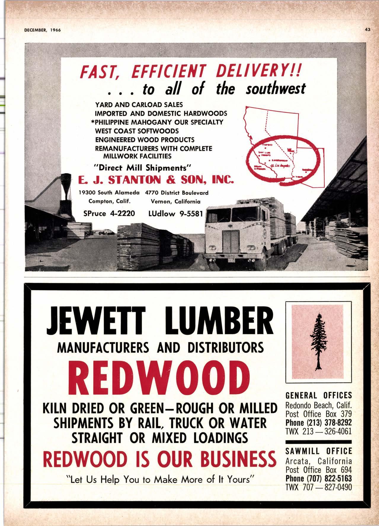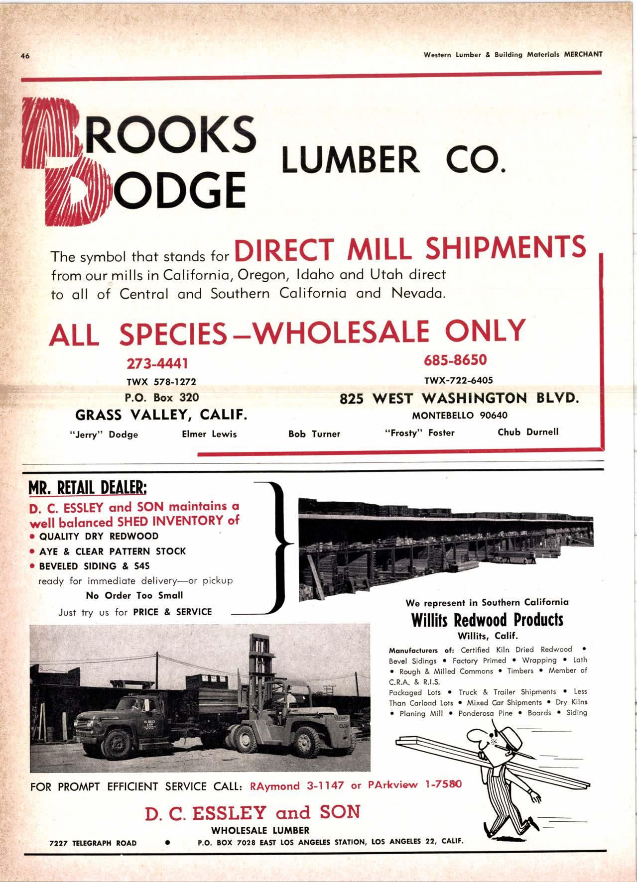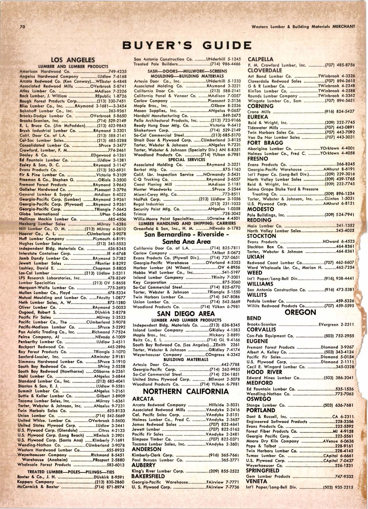 NolPok Corp. ----(2131 tUdlow 3-1056 Regol Industries ------------(2131 231-1033 Sccurity Pqint rvtfg. Co. -----.------..-.ANgclus l-0358 Trimco ---......---- --------------------,--728-3U2 Willir-Aioorr Point Spcciollics...*.--.-LOrrqi nc 4-4501 tulllEl HANDIINC ANO SHIPPING; CARRIERS Grccnicld & Son, Inc., H. }L .----.---NEvodq 6-1783 Son Bernordino - RiversideSonio Ano Areo Cofifornio Door Co. of L.A. ..---.----------l7l1l 825'7811 Wcrlcrn lurnbcr & Bullding ilorerioh mEfCHANt CAtPEttA F. l'f Crowford lumbcr, lnc. -----------{707l.at5-8756CLOVERDATE ' Arl Bond Lumbcr Co. .-.-----.---.-.TWinbrook 4-3326 Cfovcrdole Redwood Solcr -.--.-.--.--(7071 891.2515 G & R Lumbcr Co. ...-....-....-..--.-.-TWinbrook 1-221t' KinTon Lumbcr Co. ......------......-...TWinbrook 1-2585' Rounds [umbor Compony .--.---.-.-----.TWinbrook 4-3362 Wingole lumber Co., Som -------..-...-.-.-l707l 894'5521 Crone Mills ---.--..--........(916) 821'5127 EUREKA Reid & Wrighf , Inc. -...------.------------...---.(2091 222-7715 Tidcwoler Mif ls .--------- -.--.--.---------VO7l,f43-0891 fwin Horbors Safes Co. -.-.---------{/On 43-7@2 Von De Nor Lumber Soles -----------.---.--.VO7l .f,f3-3031 FORT BRAGG Aborigine Lumber Co. ....-.-----.-.-..---.YOrktown 4+{0Ol Holmes Lumber Co,, Frcd C. ..-.-.----YOrktown 4rO5E FRESNO Evonr Produclr Co' ..------------ ----------------26&8215 Georgio-Pocifl c Worehousc ....--.------..AJtAhurst 8-6191 Int'l Poper Co. (long-Bell Div.l------.------(2091 229'3016 North Vollcy Lurnbcr Sotcr .-.---.---12091 139'1755 Reid & Wright, Inc.-------------------^----------(2091 222-7715 Selno Grope Stqkc Yord & Presrurc Tr6oting Co. .------.--..---*--.-12001 89&1234 Torler, Webslcr & Johnron, lnc. -------Cl'inlon l-5O31 U.S. Plywood Corp. .-.-----.--.----.---...Ailhurst 6-8121 MODESTO Polc Bulldingr, lnc. REDDING Jrtoin tumbcr Co. .-.__..__.___._--__..__..__._-*2.11 _l 352 Norlh Voltey tumbcr Solcr-..-..-..-..---.-.----213-1025 STOCKTON 521-791r Tcrler, Websler & Johnron 161-8361 ,l' UKIAH : Redwood Coosl lumber Co.---.-.-..--------.(70n a62-86O7''i Word Wholesqfc tbr, Co., Msrion H. ---.----162-7251 ;t WEED i f nr'l Poperllons-Belt Div.---.---.---.-.---.--..(91 61 938-44,1l .l wltuAl s .:i Evons Producls ...-.-----HOword 6-1523,; Stockton Box Co. --..-....-.,f64'8!61 " Podulo Lumber Co. .-.-..-.--..----..-.---------...f59-5326 Willits Redwood Products Co.-----------17O71,t59-5595 OREGON BEND Brooks-Sconlon --------EVergreen 2-2511 coRvAtUs