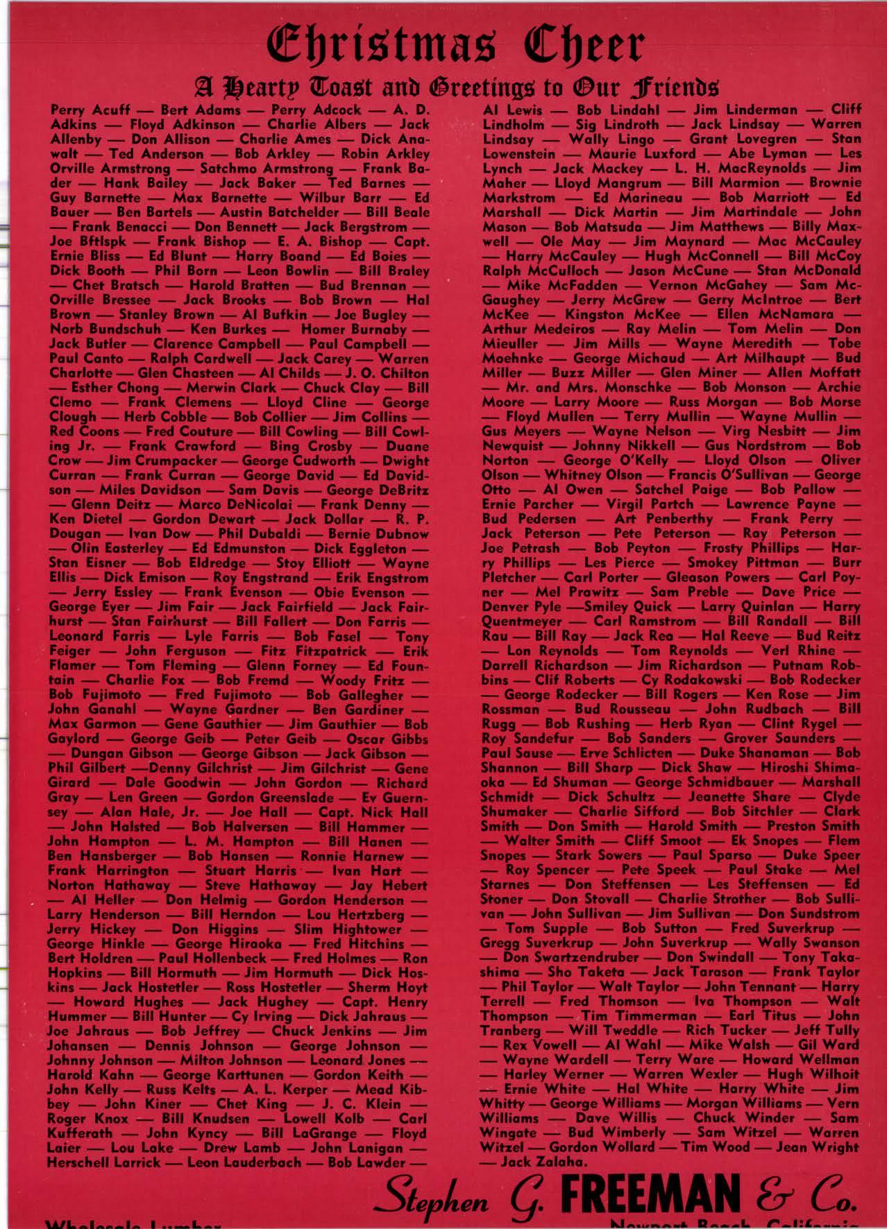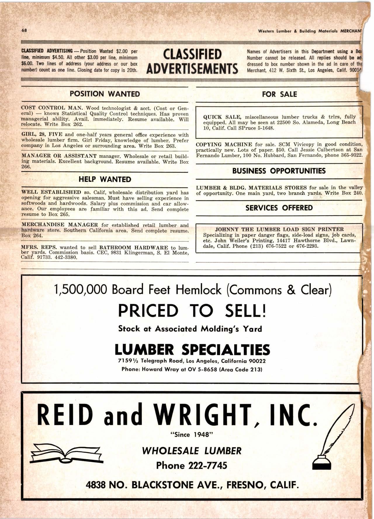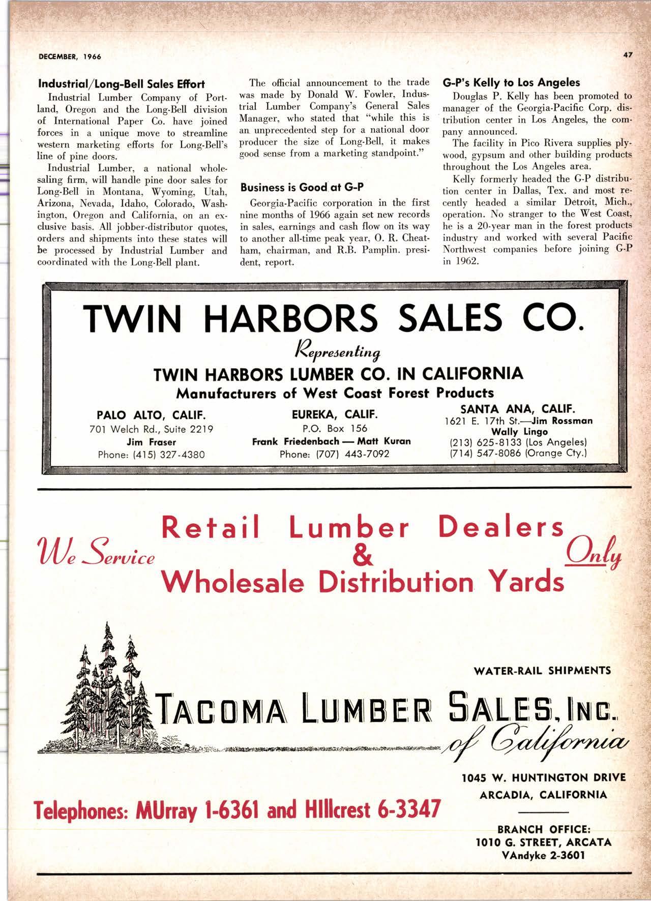 NolPok Corp. ----(2131 tUdlow 3-1056 Regol Industries ------------(2131 231-1033 Sccurity Pqint rvtfg. Co. -----.------..-.ANgclus l-0358 Trimco ---......---- --------------------,--728-3U2 Willir-Aioorr Point Spcciollics...*.--.-LOrrqi nc 4-4501 tulllEl HANDIINC ANO SHIPPING; CARRIERS Grccnicld & Son, Inc., H. }L .----.---NEvodq 6-1783 Son Bernordino - RiversideSonio Ano Areo Cofifornio Door Co. of L.A. ..---.----------l7l1l 825'7811 Wcrlcrn lurnbcr & Bullding ilorerioh mEfCHANt CAtPEttA F. l'f Crowford lumbcr, lnc. -----------{707l.at5-8756CLOVERDATE ' Arl Bond Lumbcr Co. .-.-----.---.-.TWinbrook 4-3326 Cfovcrdole Redwood Solcr -.--.-.--.--(7071 891.2515 G & R Lumbcr Co. ...-....-....-..--.-.-TWinbrook 1-221t' KinTon Lumbcr Co. ......------......-...TWinbrook 1-2585' Rounds [umbor Compony .--.---.-.-----.TWinbrook 4-3362 Wingole lumber Co., Som -------..-...-.-.-l707l 894'5521 Crone Mills ---.--..--........(916) 821'5127 EUREKA Reid & Wrighf , Inc. -...------.------------...---.(2091 222-7715 Tidcwoler Mif ls .--------- -.--.--.---------VO7l,f43-0891 fwin Horbors Safes Co. -.-.---------{/On 43-7@2 Von De Nor Lumber Soles -----------.---.--.VO7l .f,f3-3031 FORT BRAGG Aborigine Lumber Co. ....-.-----.-.-..---.YOrktown 4+{0Ol Holmes Lumber Co,, Frcd C. ..-.-.----YOrktown 4rO5E FRESNO Evonr Produclr Co' ..------------ ----------------26&8215 Georgio-Pocifl c Worehousc ....--.------..AJtAhurst 8-6191 Int'l Poper Co. (long-Bell Div.l------.------(2091 229'3016 North Vollcy Lurnbcr Sotcr .-.---.---12091 139'1755 Reid & Wright, Inc.-------------------^----------(2091 222-7715 Selno Grope Stqkc Yord & Presrurc Tr6oting Co. .------.--..---*--.-12001 89&1234 Torler, Webslcr & Johnron, lnc. -------Cl'inlon l-5O31 U.S. Plywood Corp. .-.-----.--.----.---...Ailhurst 6-8121 MODESTO Polc Bulldingr, lnc. REDDING Jrtoin tumbcr Co. .-.__..__.___._--__..__..__._-*2.11 _l 352 Norlh Voltey tumbcr Solcr-..-..-..-..---.-.----213-1025 STOCKTON 521-791r Tcrler, Websler & Johnron 161-8361 ,l' UKIAH : Redwood Coosl lumber Co.---.-.-..--------.(70n a62-86O7''i Word Wholesqfc tbr, Co., Msrion H. ---.----162-7251 ;t WEED i f nr'l Poperllons-Belt Div.---.---.---.-.---.--..(91 61 938-44,1l .l wltuAl s .:i Evons Producls ...-.-----HOword 6-1523,; Stockton Box Co. --..-....-.,f64'8!61 " Podulo Lumber Co. .-.-..-.--..----..-.---------...f59-5326 Willits Redwood Products Co.-----------17O71,t59-5595 OREGON BEND Brooks-Sconlon --------EVergreen 2-2511 coRvAtUs