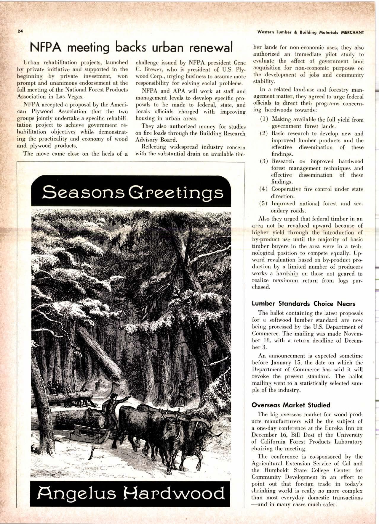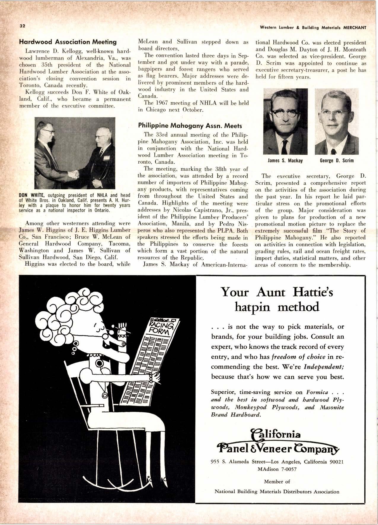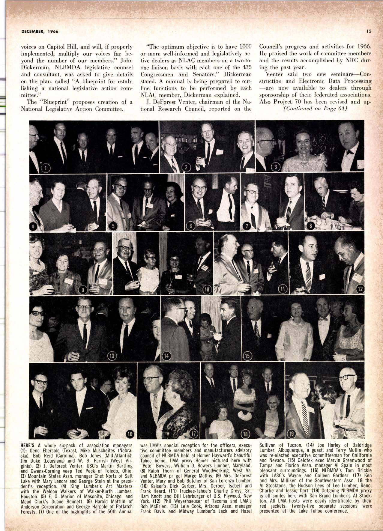 The stars of the show were fellows like Gene Brewer, president of U.S. Plywood and the NFPA, Lowrey Wyatt and Bernie Orell, Weyerhaeuser vps, Chuck Morey, St. Regis Paper executive and Harley Langdale, Jr., President of the Southern Pine Association.