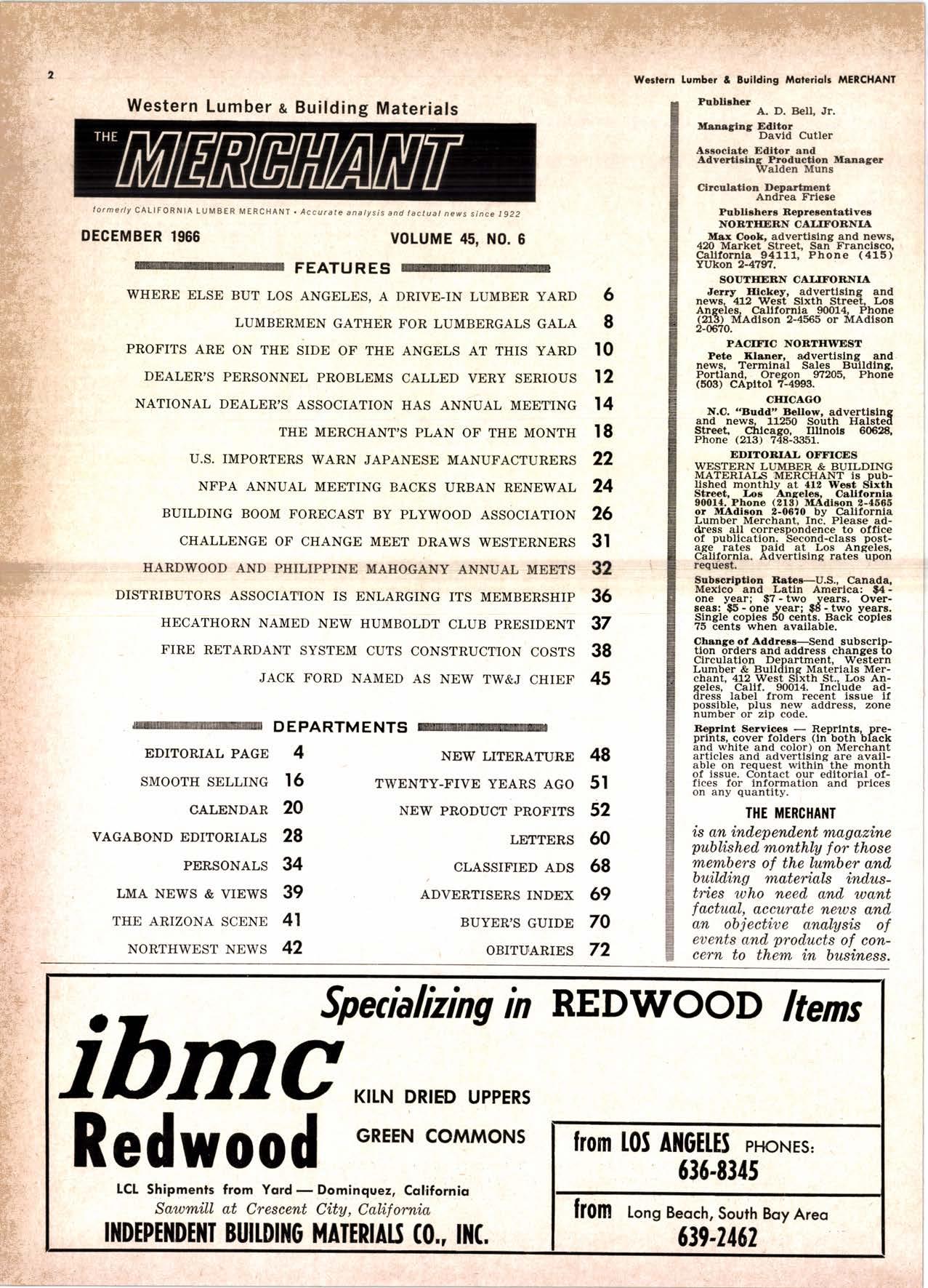 MATERIAT S MERCHANT is Dub- lished monthly at 412 Weat Slxth Streot, Loe Angele8, Callfornla 90014. Phono (213) MAdison 2-4665 or MAdleon 2-0670 bv Californla Lumber Merchant. Inc-. Please address all corresDondence to office of Dubllcation. Second-class Dostage rates paid at Los Anieles, Californla. Advertising rates upon request.