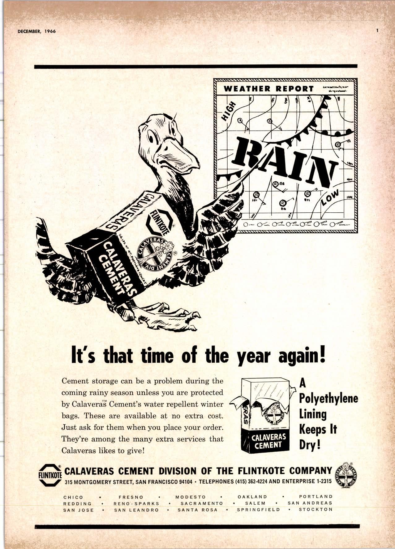 Cement storage can be a problem during the coming rainy season unless you are protected by Calavera'd Cement's water repelient winter bags. These are available at no extra cost. Just ask for them when you place your order. They're among the many extra services that Calaveras likes to give!