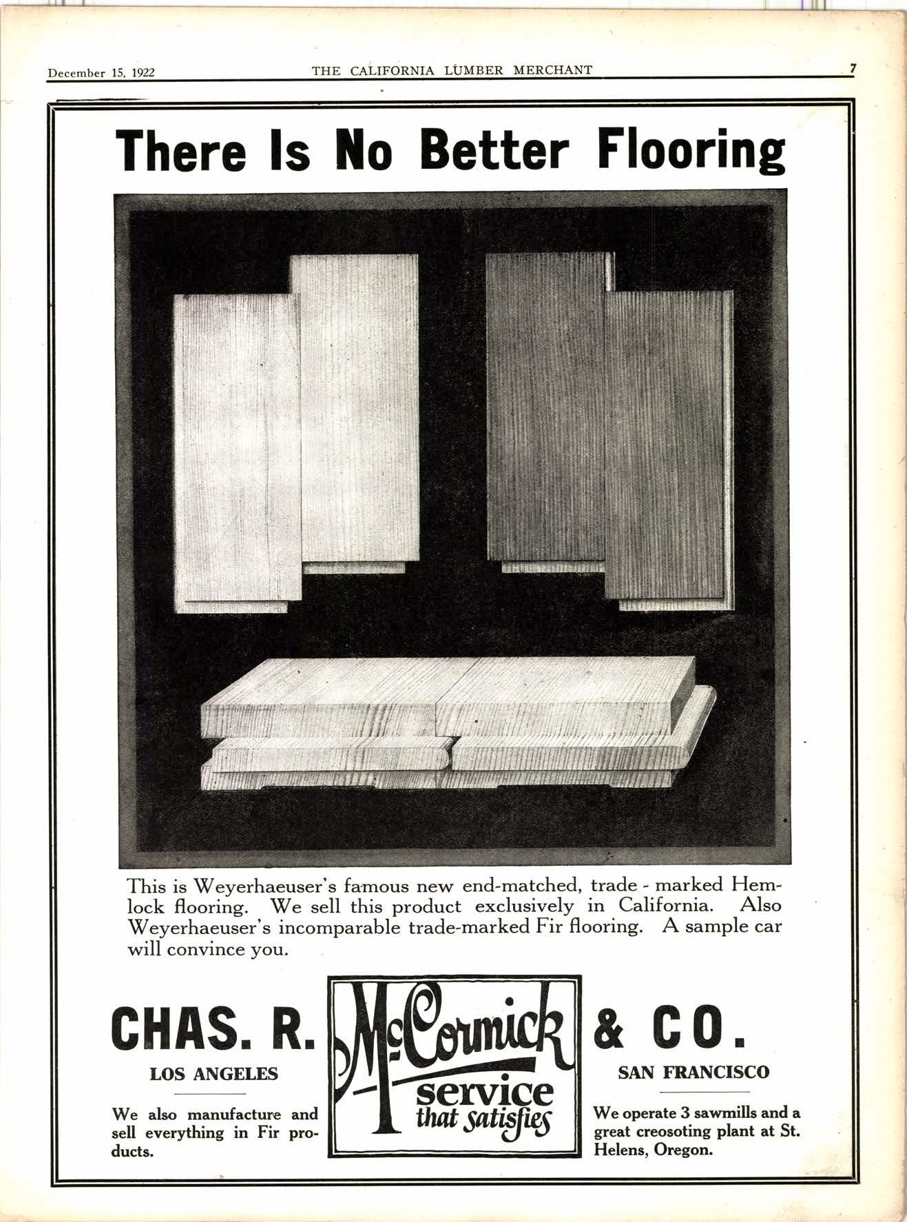 This is Weyerhaeuser's fatnous new end-matched, trade - marked Hemlock fooring. We sell this product exclusively in California. Also Weyerha.,r"et's incomparable trade-marked Fir fooring. A sample car will convince you
