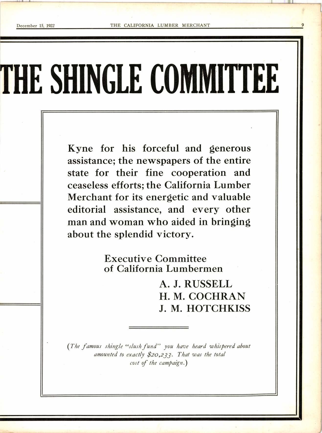 Kyne for his forceful and generous assistance; the newspapers of the entire state for their fine cooperation and ceaseless efforts; the California Lumber Merchant for its energetic and valuable editorial assistance, and every other man and woman who aided in bringing about the splendid victory.
