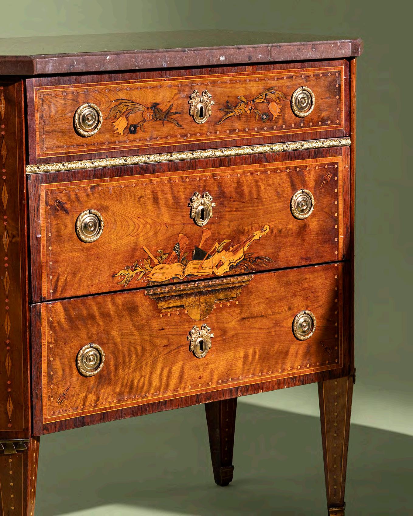 Fanerad med björk, jakaranda, fruktträ, mfl träslag. Samkomponerad front med motiv av ymnighetshorn ovan fruktkorg, samt sidstycken med dekor av stiliserade urnor. Beslag av förgylld mässing. Tre lådor. Skivor av grå kalksten. Ej signerade. En nyckel medföljer.