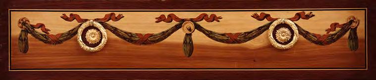 21. Sekretär, av Georg Haupt (mästare 1770 – 1784 Stockholm), Gustaviansk. Fanerad med björk, lönn, amarant, rosenträ, platan, plommon, buxbom och ebenholz. Rak form med avfasade hörn. Raka fyrsidiga nedåt avsmalnande ben. Upptill och nedtill låda. Skrivinredning med tre lådor bakom klaff. Inläggningar i form illusoriskt skuggade fält med dekor av lagerkransar och korsade lagerkvistar, bandrosetter samt hängen. Beslag av förgylld brons. Skiva av vit marmor. Ej signerad.