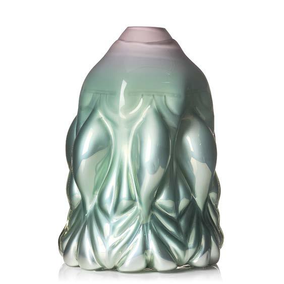 41. Jonas Rooth (Sverige, Född 1961) ljuskrona, glas, Kivik. Tolv svängda ljusarmar med lösa blomstänglar i fyra etage, dekor blått, grönt, gult och rött, signerad #01149 Jonas Rooth. Höjd 116 cm, diameter 85 cm.