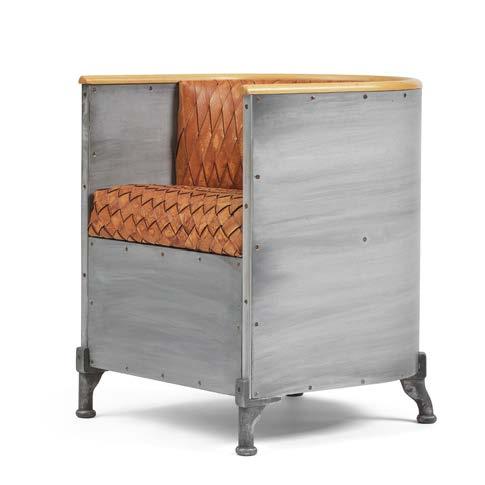 Aluminiumklädd trästomme, armlän av skiktlimmad bok, sits och rygg klädda i flätat läder, brickmärkt ALUMINIUM FÅTÖLJ No: 66/200 MATS