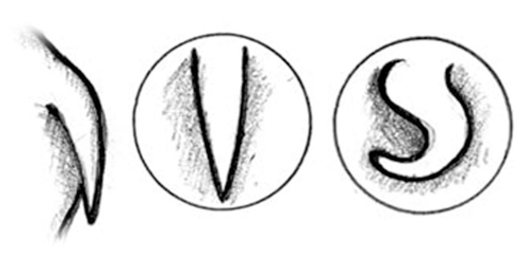 Til venstre er et billede af en normal skive, og den mørke farve viser væskeindholdet. Til højre er skiven fra en chondrodystrofisk 2 år gammel hund. Der er væsketab og tab af fleksibilitet ved CDDY, og normalt væskeindhold vil blive erstattet med porøst/mineraliseret bruskvæv/forkalkning.