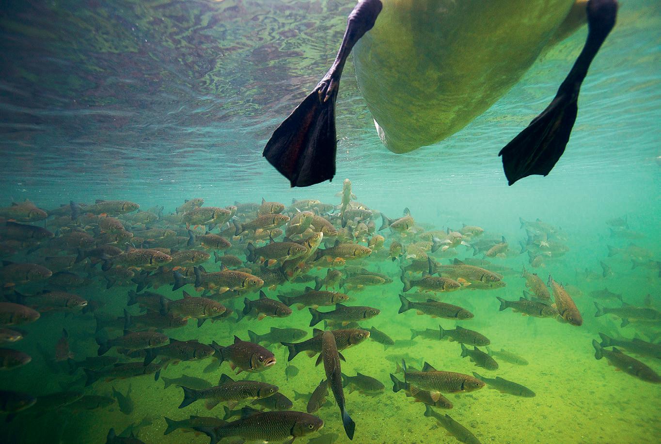 4 : Les pattes d’un cygne au-dessus des poissons, photographié en janvier 2010, dans le Rhin, à la hauteur de Schaffhouse.