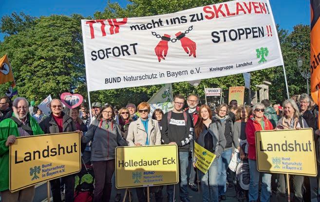 Das war wirklich etwas ganz Großes: Im Oktober sind in Berlin eine Viertelmillion Menschen auf die Straße gegangen, um zu sagen: Wir wollen keine Freihandelsabkommen, die unsere demokratischen Rechte untergraben und Verbraucherschutz- und Umweltschutzstandards abbauen. Auch zahlreiche BN-Aktive waren dabei. Dass viele von Ihnen ein Wochenende opfern, um den Protest gegen TTIP und CETA auf die Straße zu tragen, ist nicht selbstverständlich. Vielen Dank dafür! Auch wenn manche Politiker, allen voran EUHandelskommissarin Cecilia Malmström, nach wie vor so tun, als könnten sie einen derart massiven Protest ignorieren, so zeigt er doch