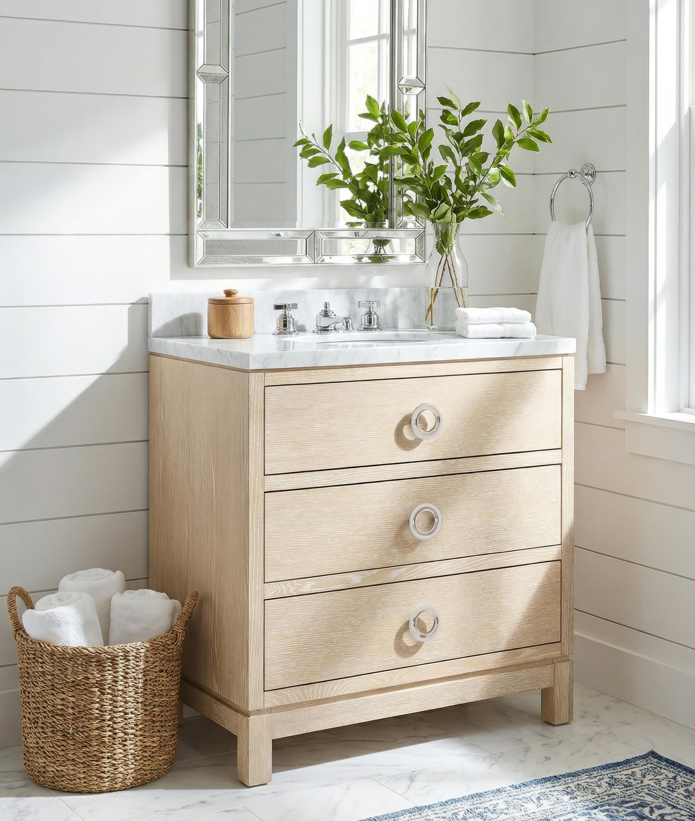 2-DRAWER CABINET WITH 30” MARBLE VANITY TOP SAND, CLEAR LACQUERED BLEACHED CERUSED OAK WOOD AND VENEERS, POLISHED AND SEALED WHITE CARARRA MARBLE, POLISHED NICKEL FINISHED CAST METAL