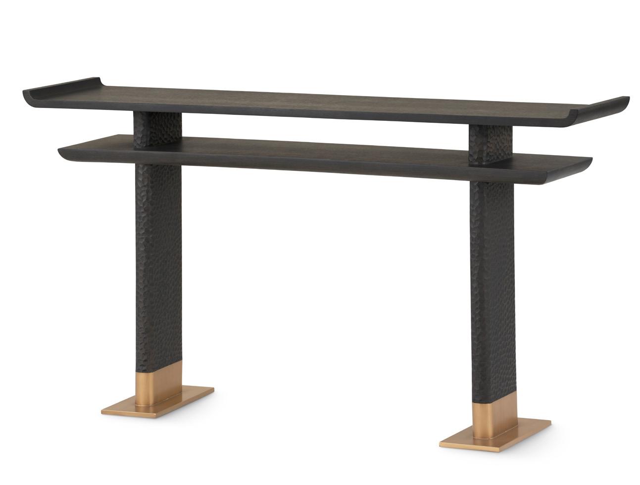 ESPRESSO, CLEAR LACQUERED STAINED OAK WOOD AND VENEERS, ANTIQUE BRASS FINISHED CAST METAL