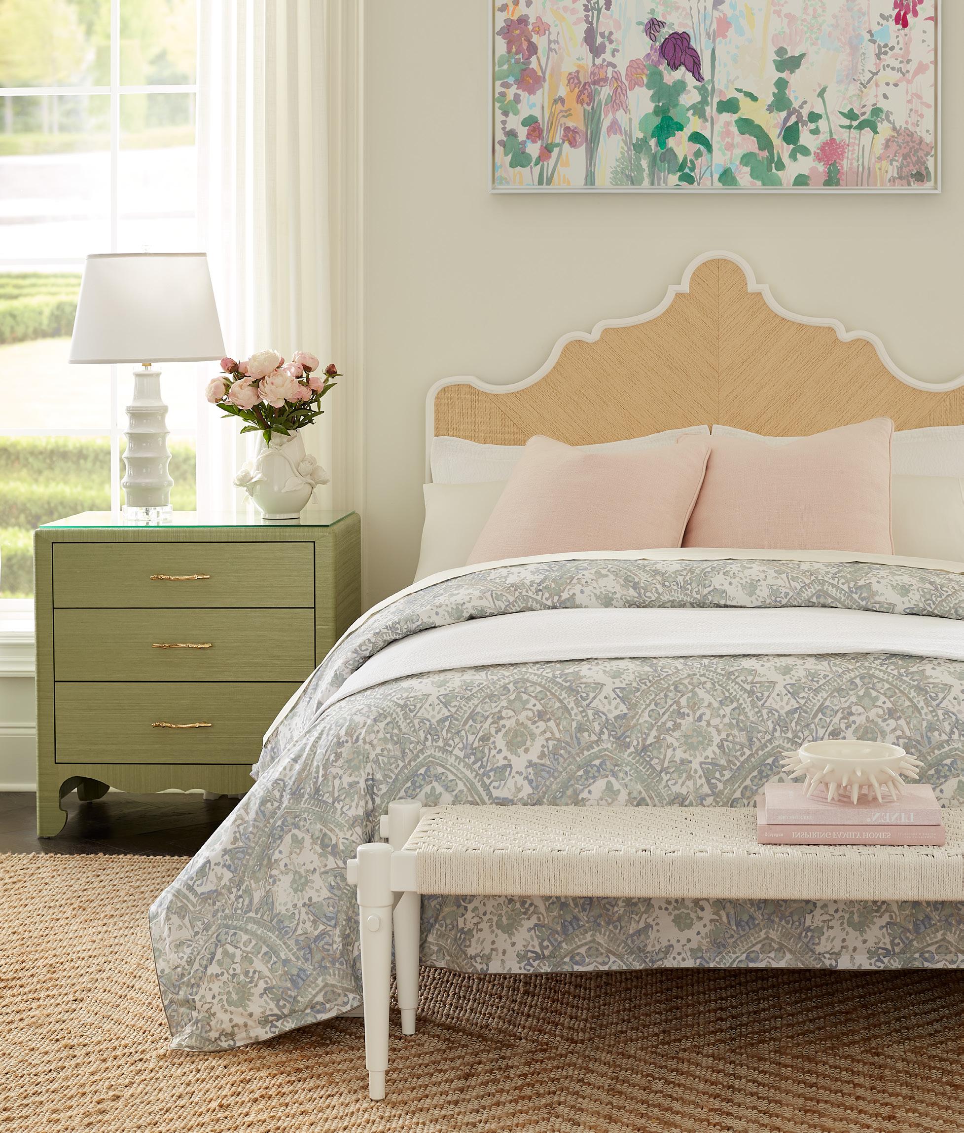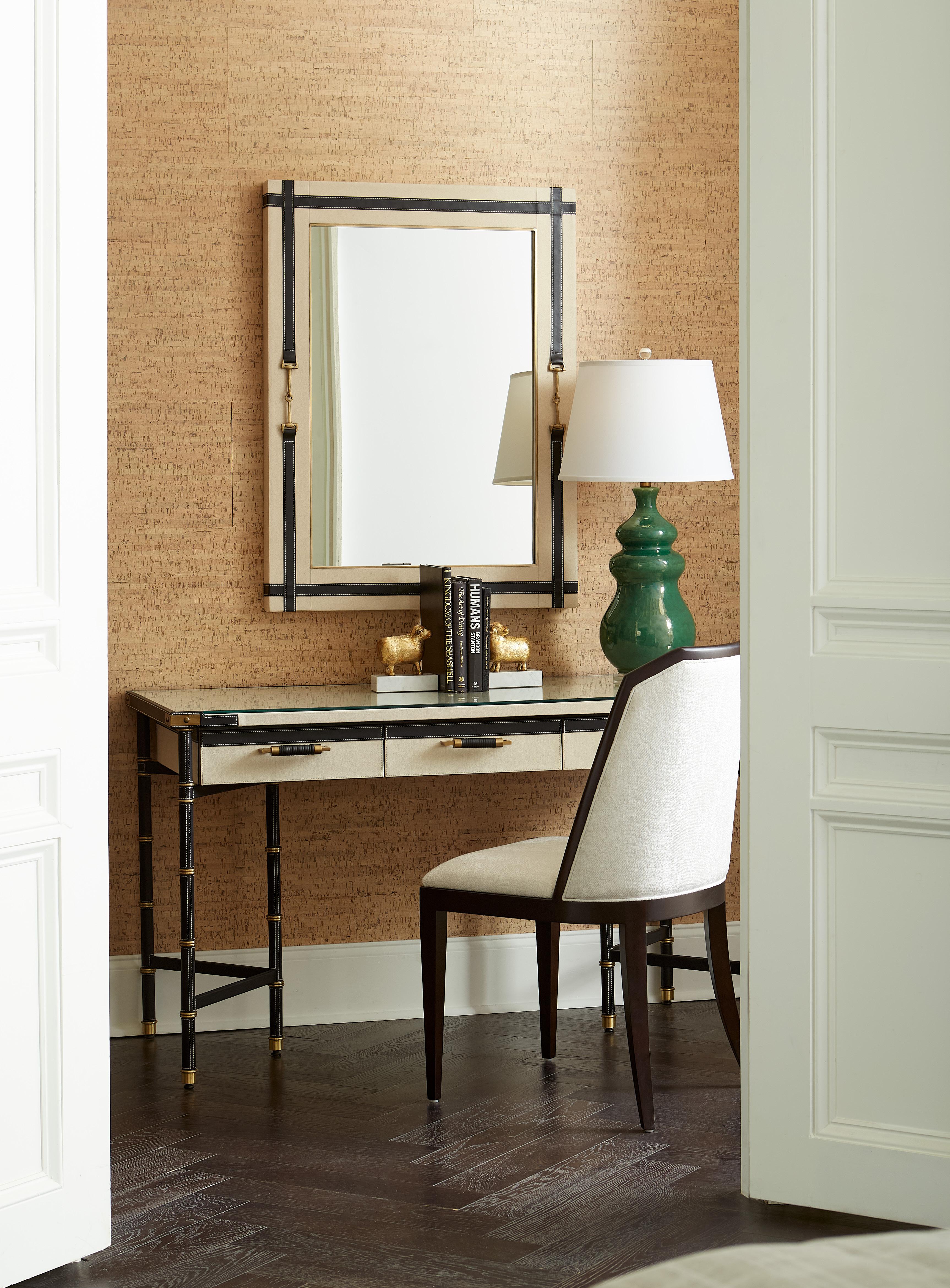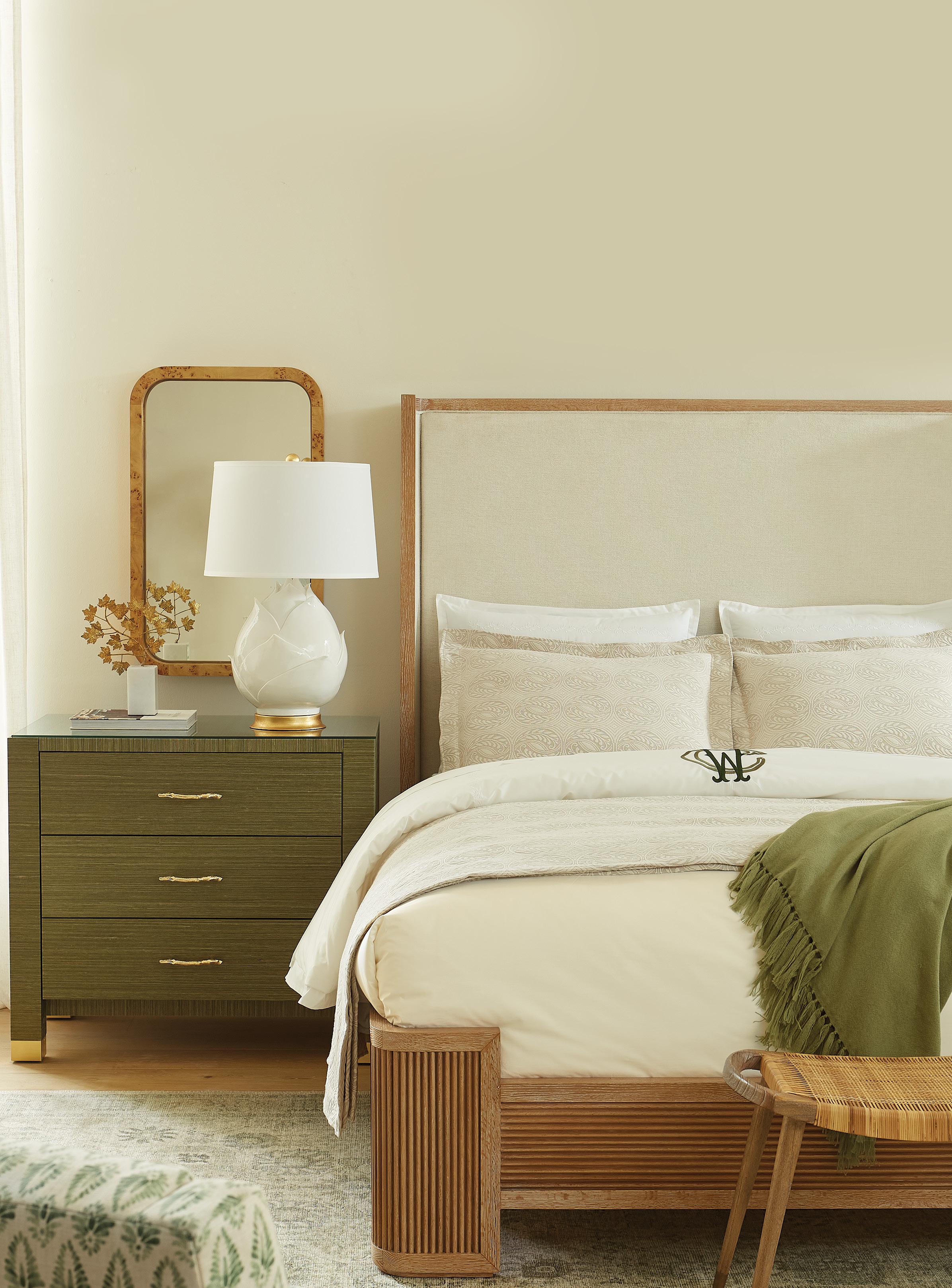 LACQUERED CERUSED OAK WOOD AND VENEERS, WOVEN ENGINEERED FABRIC, ANTIQUE FINISHED CAST BRASS