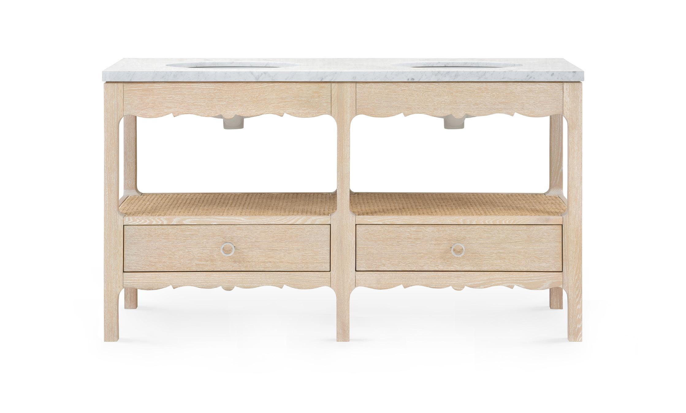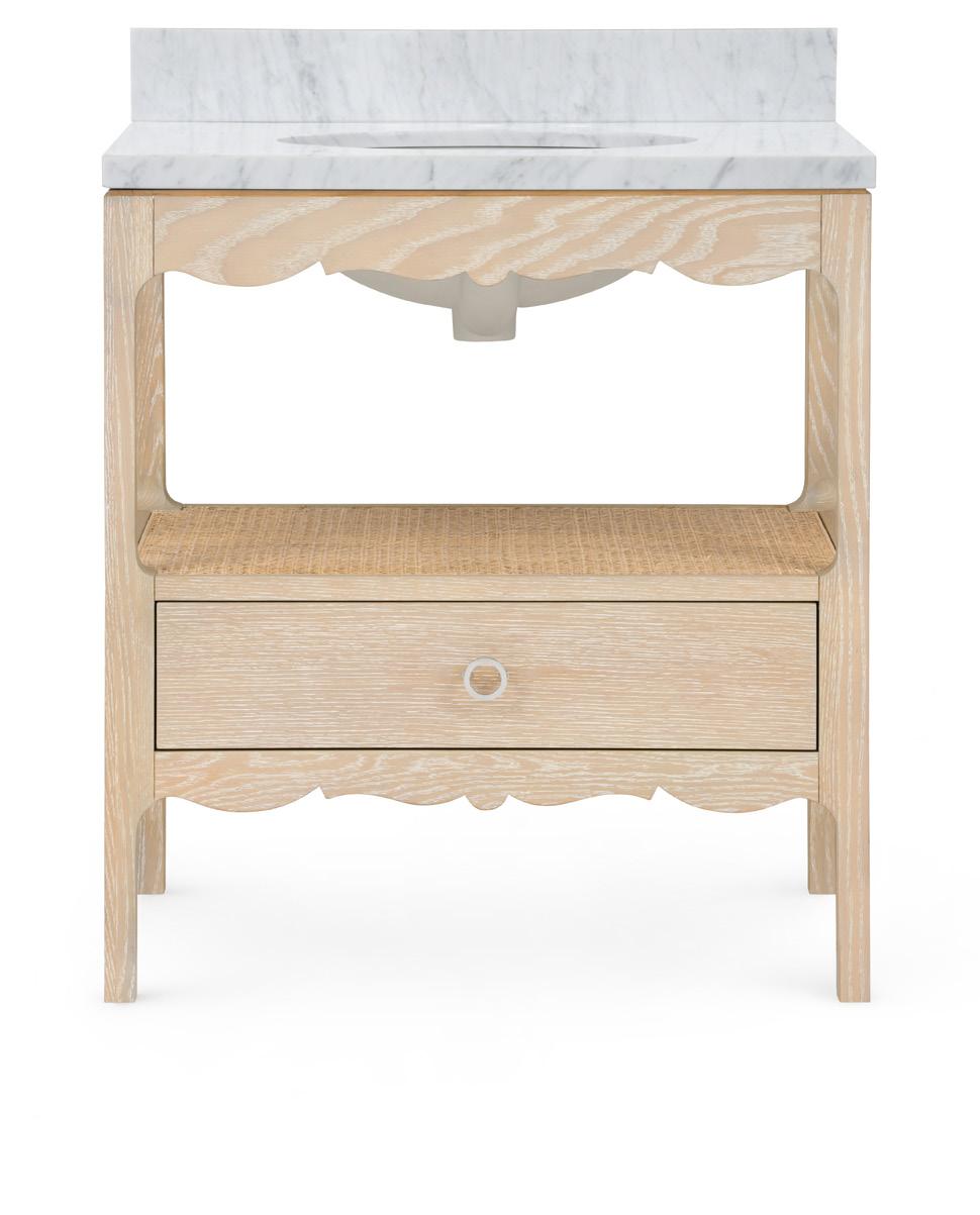 SAND, CLEAR LACQUERED BLEACHED CERUSED OAK WOOD AND VENEERS, POLISHED AND SEALED WHITE CARARRA MARBLE, CLEAR LACQUERED CANE, POLISHED NICKEL FINISHED CAST METAL