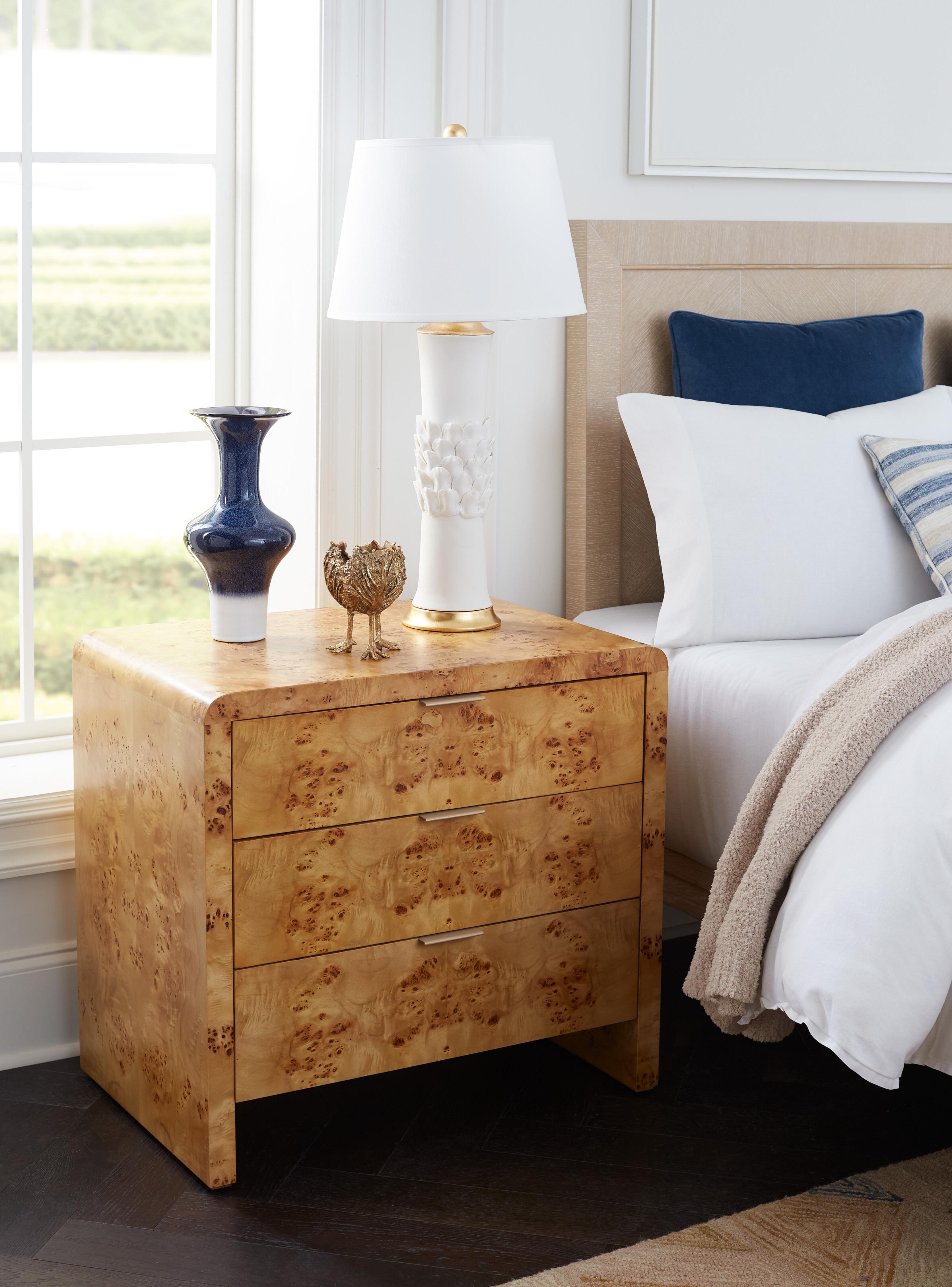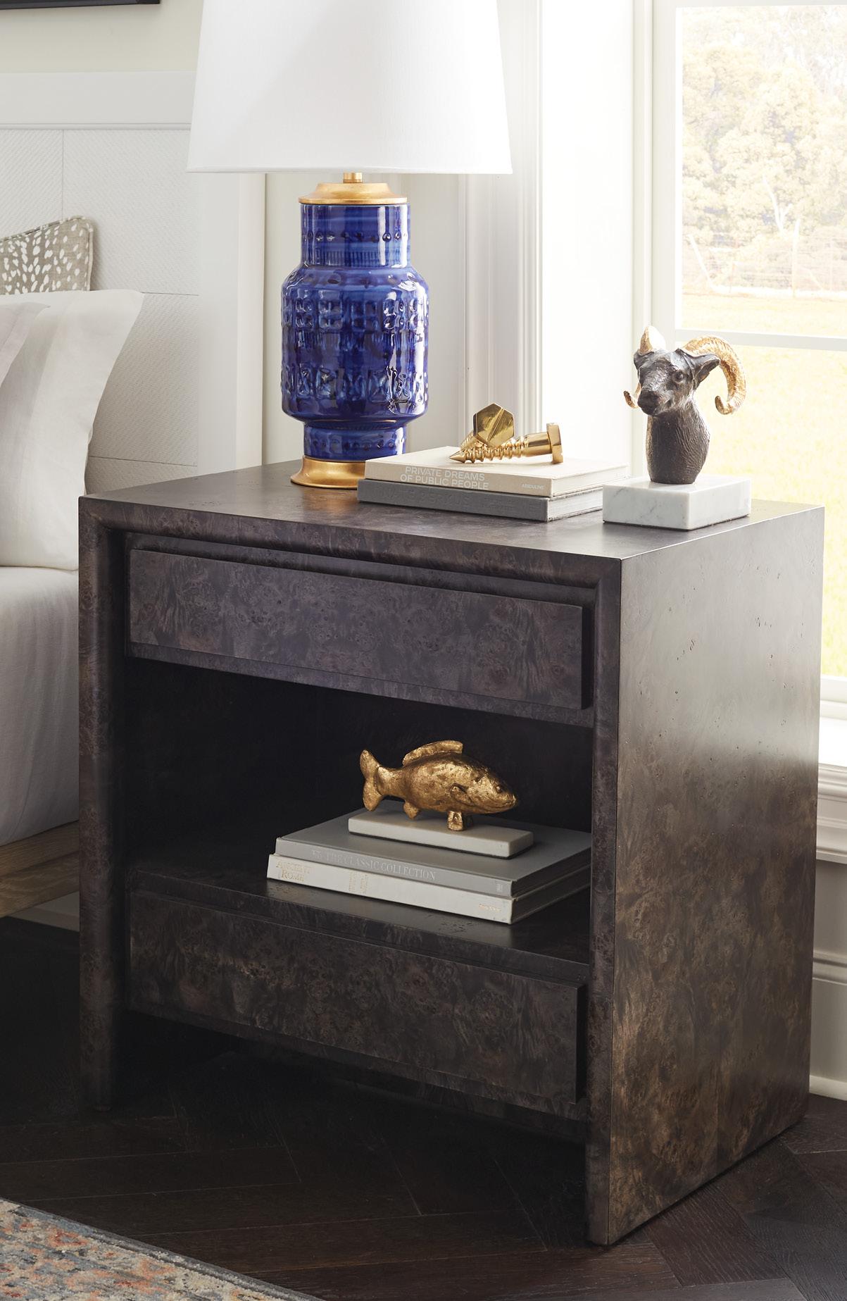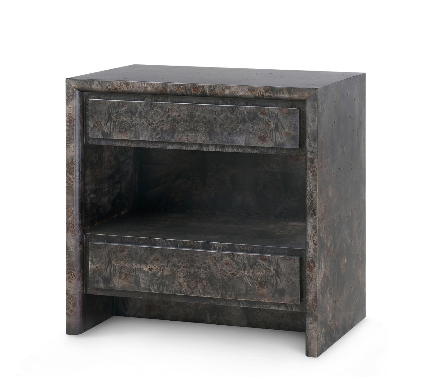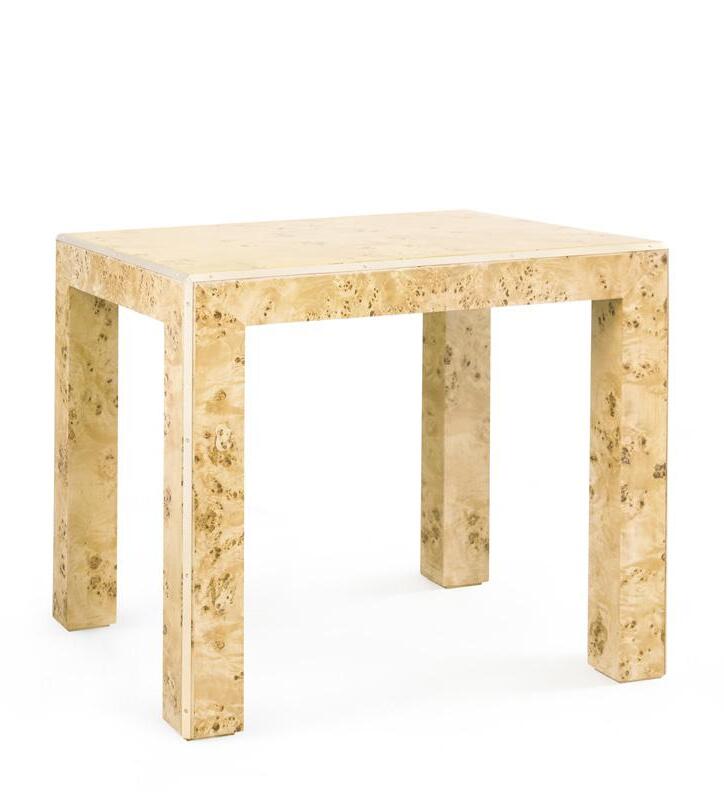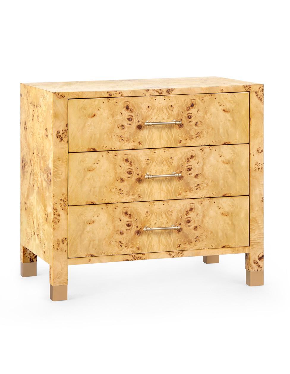 BURL, CLEAR LACQUERED WOOD AND VENEERS WITH BRUSHED BRASS PULLS