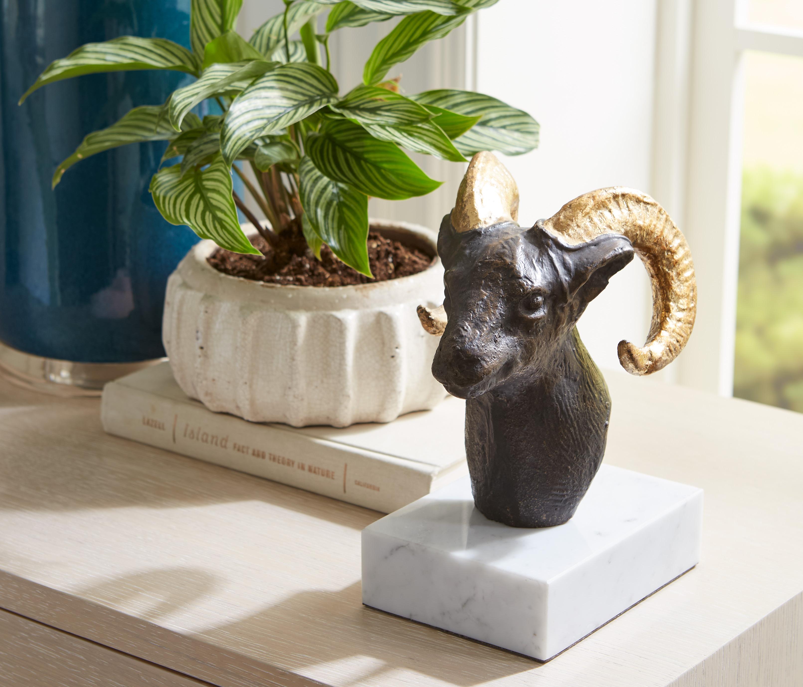 55 STATUES & DECORATIVE OBJECTS RAM STATUE HAND-CAST METAL WITH BRONZE & GOLD FINISH & WHITE MARBLE BASE RAM-700-804 6.5W x 6.5D x 9.5H