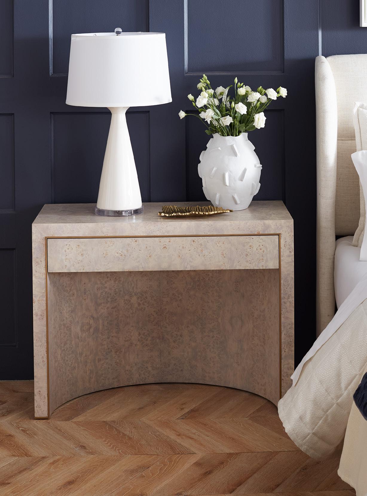 NATURAL TWILL, CLEAR LACQUERED GRASSCLOTH WITH VANILLA PIGMENTED LACQUERED WOOD AND VENEERS