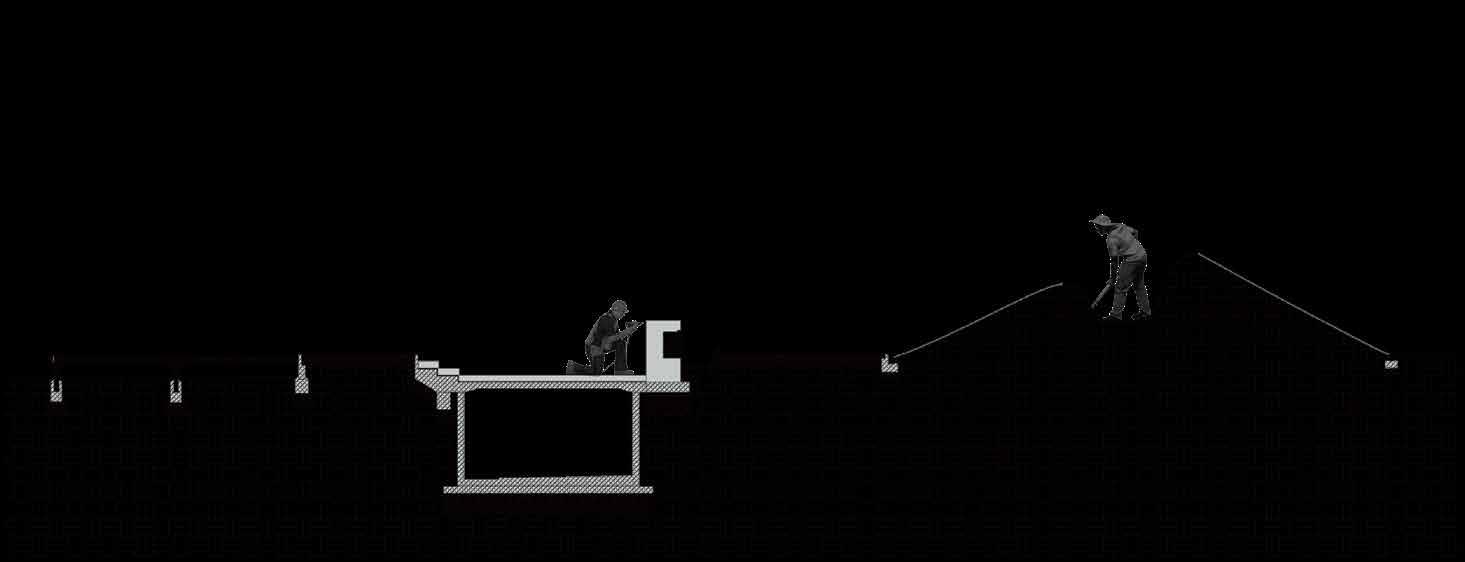 The gabion seats near the intersection of the main path and meadows provide visitors with seating space. The U-shaped structure allows it to be used for small gatherings, while the gabion wall at the edge of the sunken green spaces provides shelters for small animals and insects.