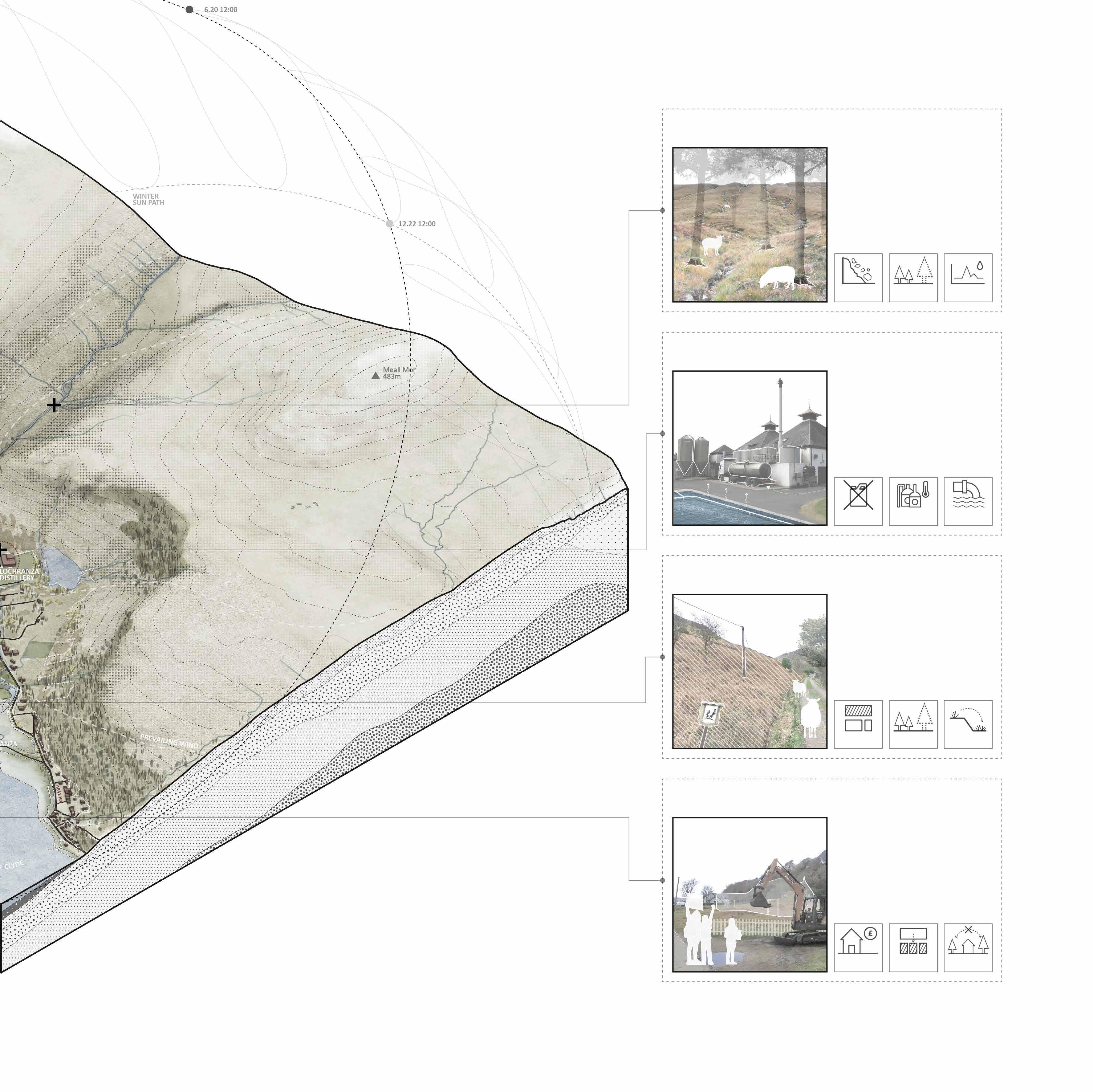 My project 'Whisky Township' is designed to establish a new sustainable relationship between whisky production, rural life, and environment conservation. The key points are energy, resources and waste management, which focus on the local production of whisky raw materials, conservation of local natural resources, the local use of whisky by-products and surplus energy, and waste treatment. By increasing energy efficiency, reducing resource consumption, and achieving higher levels of waste recycling, whisky township will help reduce the dependence on off-island sources, and reduce the impact of human activity on the island environment.