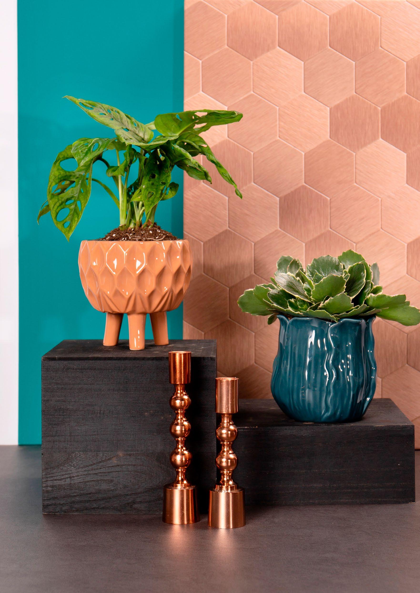 You can incorporate verdigris green into your home with more than just paint. Try a velvet fabric, ceramic tiles or other stone materials in combination with copper materials. That gives a warm and unique feeling to your interior. This trend includes lots of copper accents, clean-lined forms and arch shapes.