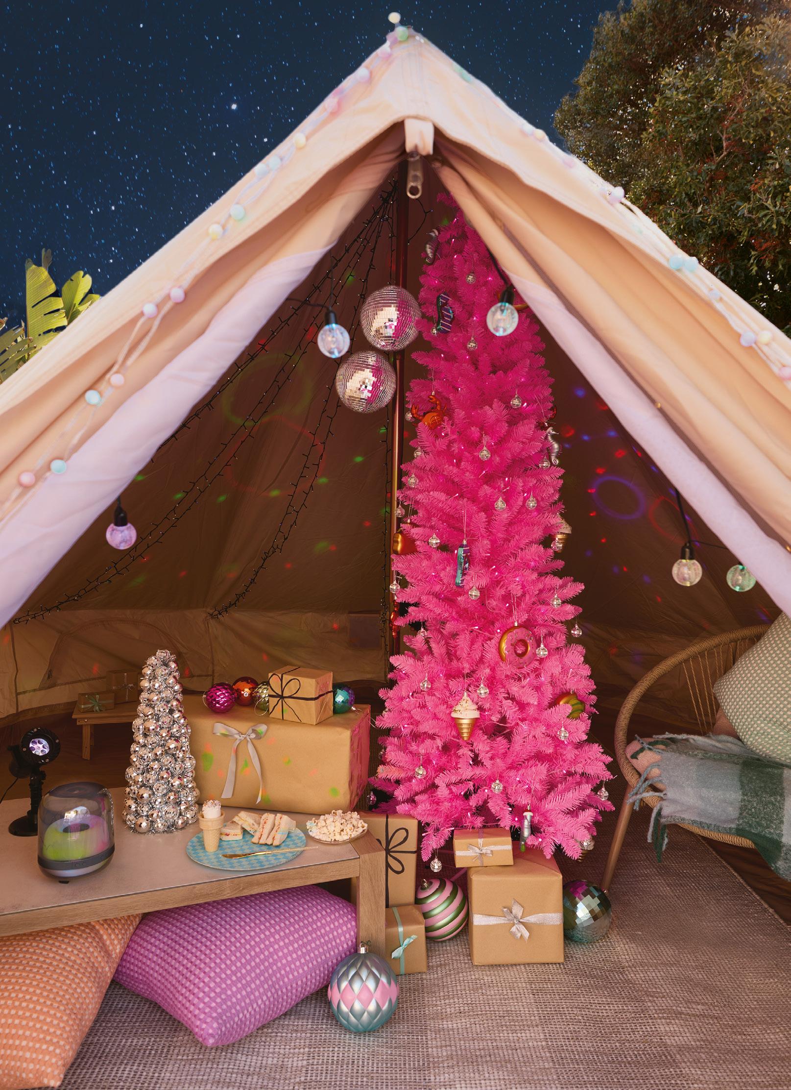 (In tent) ● Mimosa ‘Bentota’ aluminium coffee table, $259, I/N: 0762197. ● Mirabella ‘Pink Malibu’ 2.1 m pre-lit Christmas tree, $139, I/N: 0770984. ● Mirabella ‘Sunshine Spirit’ Christmas bauble sets, $25/pack of 94, I/N: 0816478, and $39/pack of 60, I/N: 0816481. ● Deck The Halls jumbo bauble ornament packs, $29 each/pack of 6, I/N: 0761796 and I/N: 0761797. (On coffee table) ● Arlec 5 theme LED party projector, $19, I/N: 0285297†. ● Lytworx multicolour party light projector, $19.90, I/N: 0617228‡ ● Mirabella ‘Disco’ Christmas tree, $59, I/N: 0771050. (On floor) ● Bayliss ‘Grove’ 290cm x 200cm wool rug, $364, I/N: 6670901. (Around tent opening) ● Mirabella ‘Symphony Light Show’ low voltage smart LED string lights, $75/pack of 160, I/N: 0771025. (On lawn) ● Mimosa ‘Circle’ rope relaxer chairs, $189 each, I/N: 0762206. ● Kit Out timber picnic tray tables, $25.44 each, I/N: 0212277. (On picnic table at left) ● Lytworx ‘Sound Sync’ USB ambient bar lights, $34/pack of 2, I/N: 0371532‡. ● Mirabella ‘Sunshine Spirit’ Christmas bauble sets, as before. ● Deck The Halls jumbo bauble ornament packs, as before. ● All Set large wood storage crate, $19.98, I/N: 0214210 painted with Rust-Oleum ‘2X Ultra Cover’ spray paint in Ultra Matt Deep Teal, $19.98/340g, I/N: 0197882.