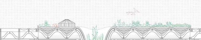 Critical new infrastructure, such as communal and educational kitchens, are placed into barges that adapt, floating to accommodate and evolve with changes in water level and allow for variety of connections between programs. Fixed structures are elevated by the water on piers, providing access and contact with the water. The spiraling greenhouse mediates the elevation and angle change between the pier structures and barges, housing hydroponic farms above water and mycoculture in darker areas below water.