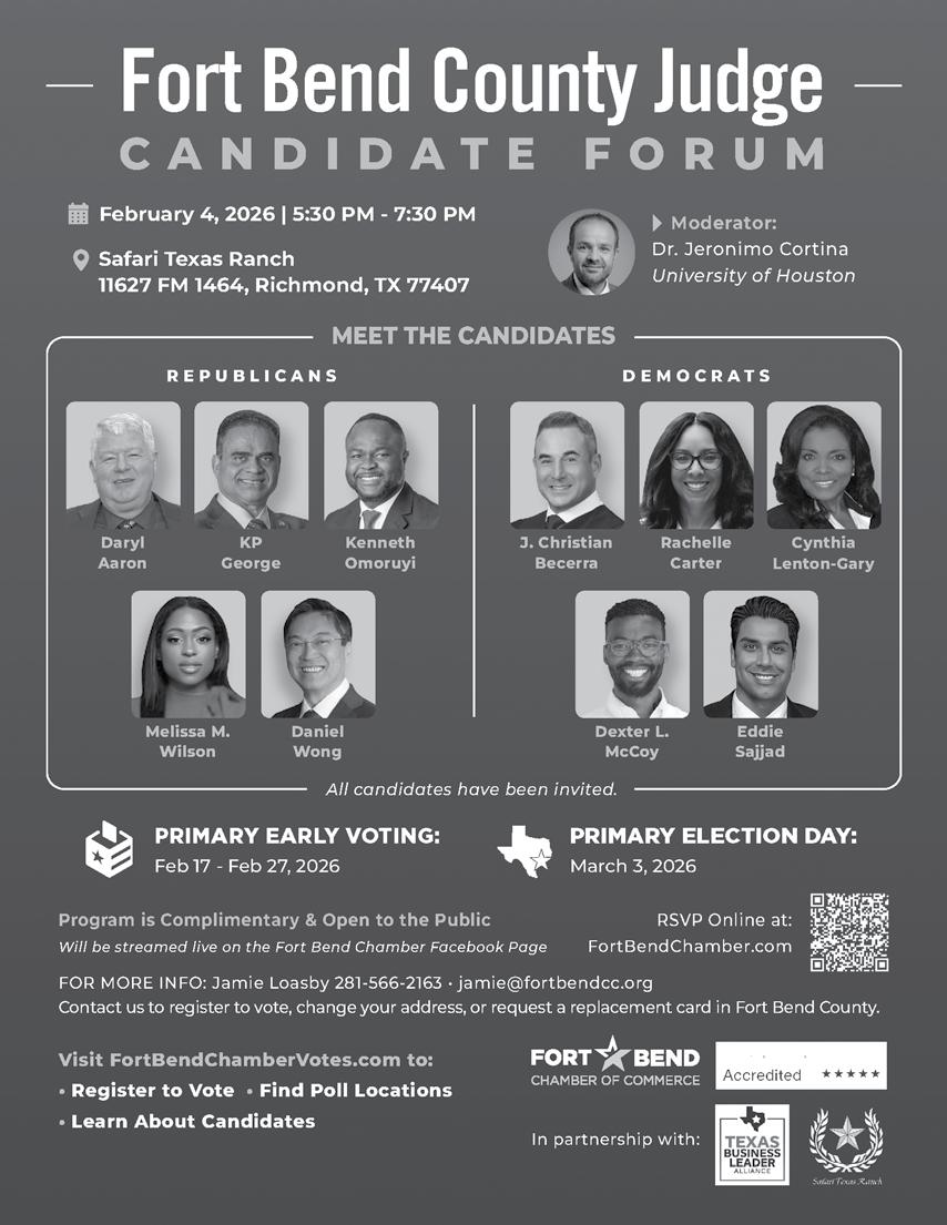 In the meantime, the defense team engaged David Medina, a former Texas Supreme Court justice now in private practice. Medina made the primary defense argument in the December hearing in which the issue of sanctions against the defense lawyers was heard. The defense team has also filed notice to call David Taylor, a prominent Houston lawyer who has long been involved in representing Republican officials, as an expert witness. The prosecutor’s office filed a motion asking PerezJaramillo to hold a hearing on whether Taylor should be admitted as an expert witness. On January 15, the judge signed an order stating that the hearing would be held at trial. According to Wittig, the third-degree felony of money laundering is punishable by between two and 10 years in state prison and up to a $10,000 fine. If convicted, George could be eligible for parole, Wittig said. As the trial is set to begin Tuesday, after the Fort Bend Star’s print deadline, the Star will provide continuing coverage on its website. fortbendstar.com.