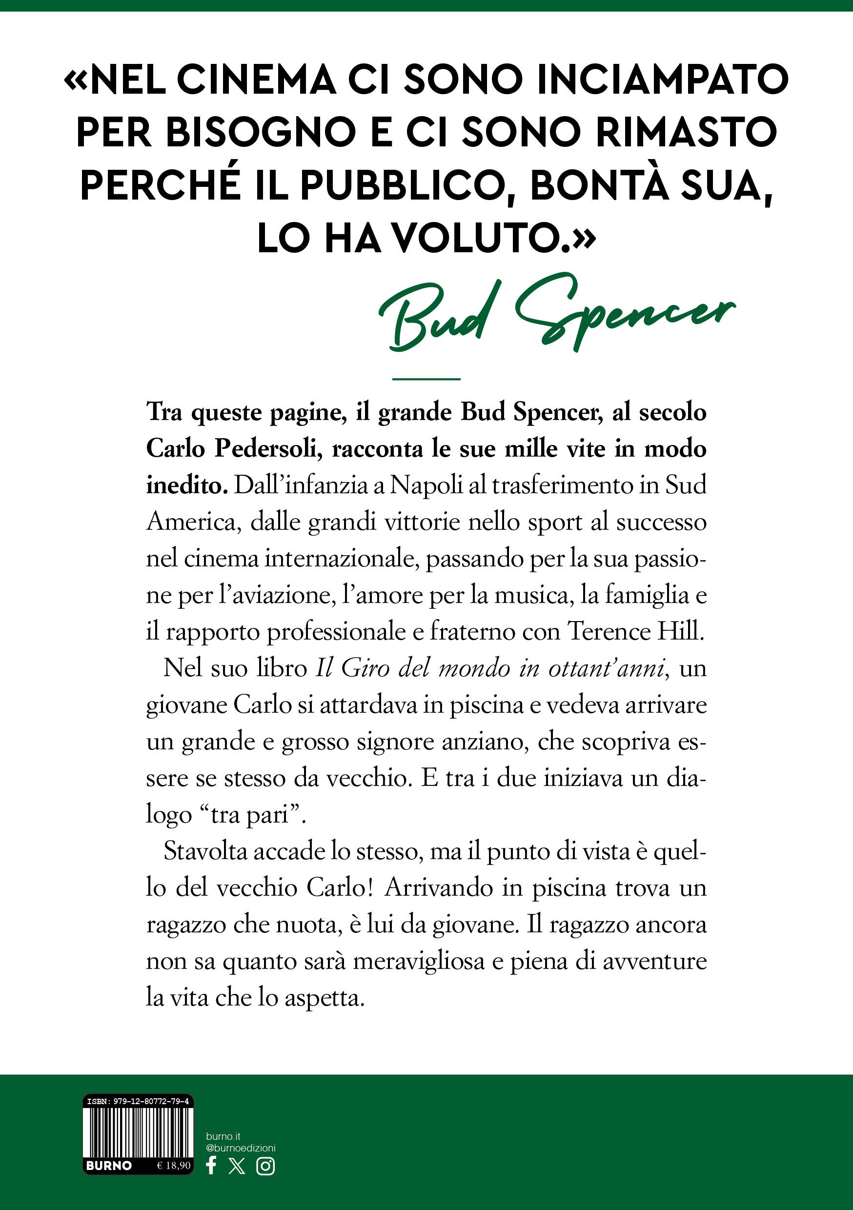 «Io invece so bene che sto parlando con Carlo Pedersoli, il campione di nuoto che ancora non ha scoperto di che pasta è fatto». Lo zittii per un istante, ma non durò troppo a lungo. Poi il giovane proseguì: «Dici? Io dico invece che la mia pasta è eccezionale: proprio oggi ho battuto il record dei cento metri stile libero, sono il primo italiano capace di scendere sotto la barriera del minuto. Una medaglia grossa così! Campione d’Italia!».