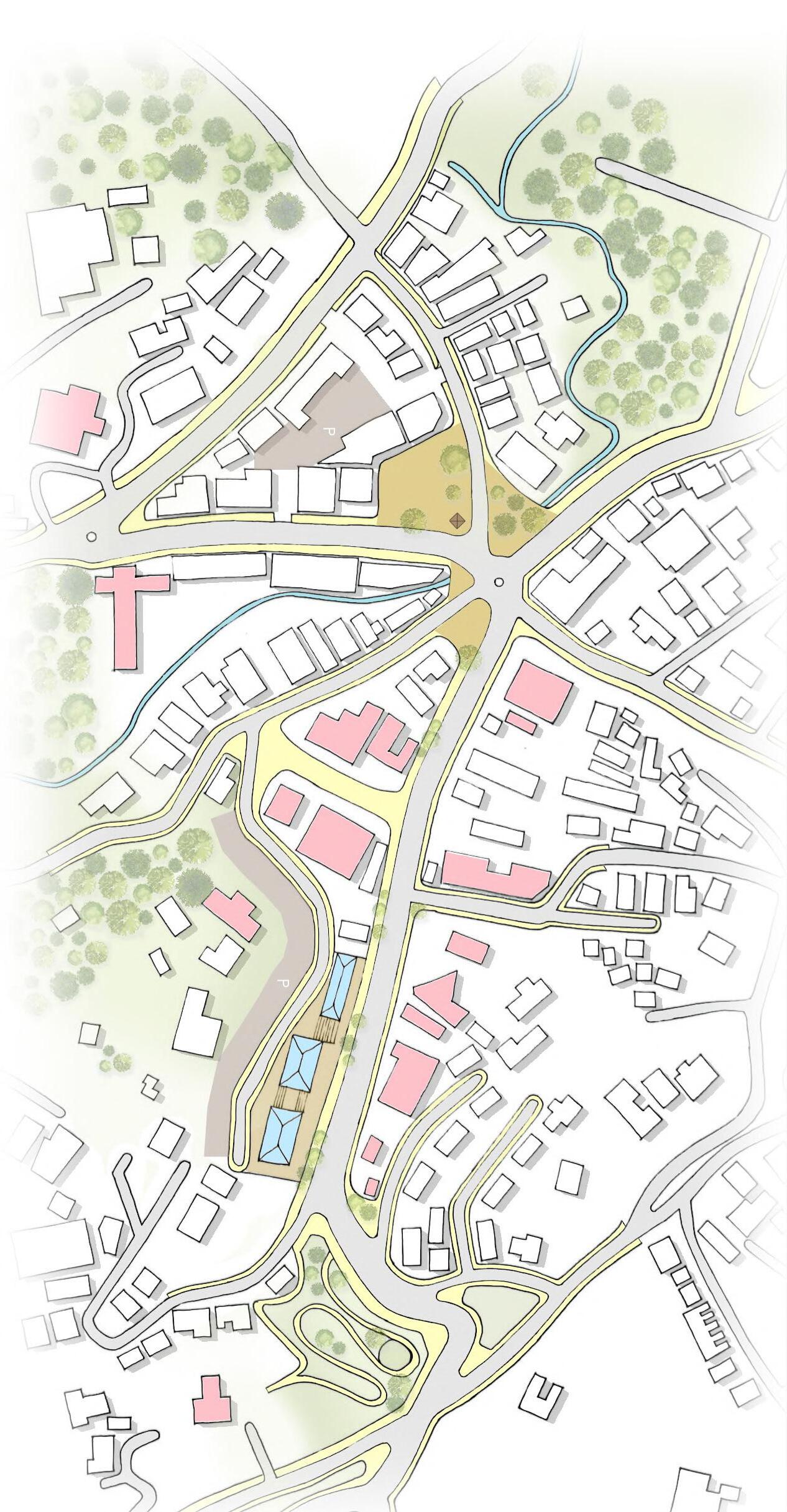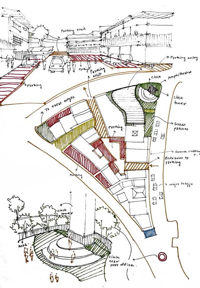 Therefore, the objective was to understand the existing scenario and prepare a suitable map for future development, trying to respect both the geographic features and the character of the town The proposal focused on development of a Central Public Plaza ,improving Pedestrian movement and creating better Edge conditions for the streets.