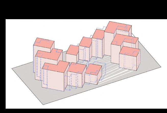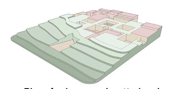 Sunken built mass in parallel grids, intercepted by courtyards