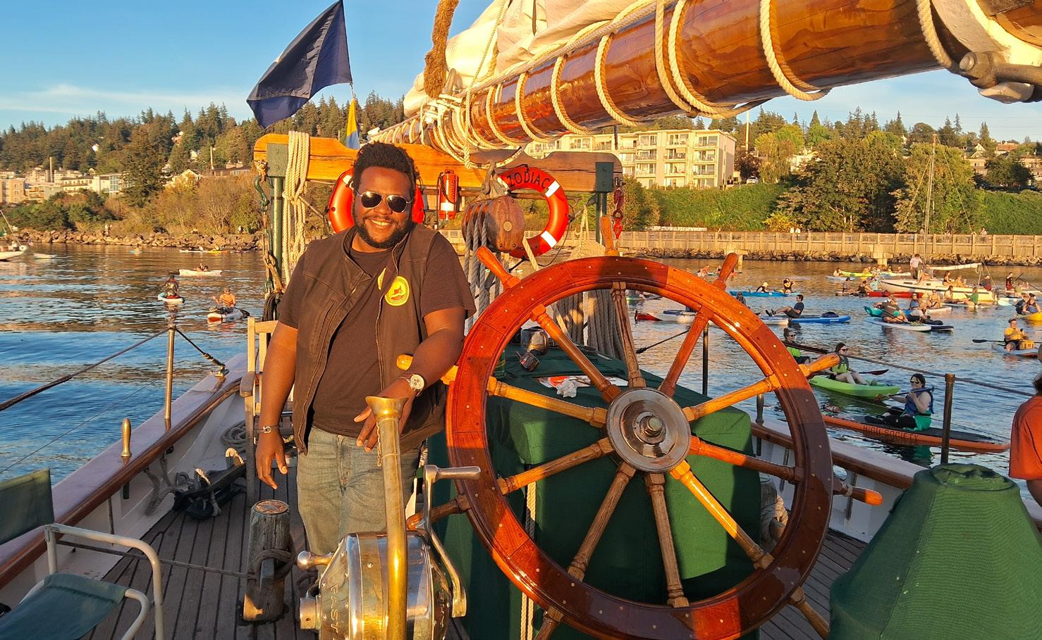 Legato Maritime owner Ryan Davis loves boats and open waters. Here, he takes the helm of the Schooner Zodiac. Photo courtesy of Ryan Davis and Legato Marine.