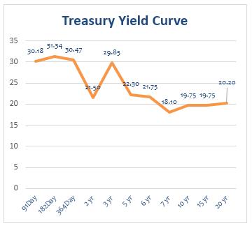 The 91-Day Bill settled at 30.18% p.a from 29.91% p.a. last week whilst the 182-Day Bill settled at 31.34% p.a from 31.14% p.a. last week. The table and graph below highlight primary market yields at close of the week.