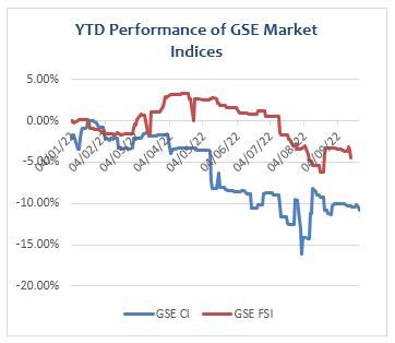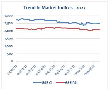 The Ghana Stock Exchange closed lower for the third consecutive week on the back of price declines by 4 counters. The GSE Composite Index (GSE CI) lost 11.69 points (-0.47%) to close at 2,488.21 points, reflecting year-to-date (YTD) loss of 10.80%. The GSE Financial Stocks Index (GSE FI) also lost 17.69 points (-0.85%) to close at 2,055.64 points, reflecting YTD loss of 4.47%.