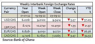 The Cedi weakened against the USD for the week. It traded at GH¢9.5414/$, compared with GH¢9.0100/$ at week open, reflecting w/w and YTD depreciations of 5.57% and 37.05% respectively. This compares with YTD depreciation of 1.78% a year ago.