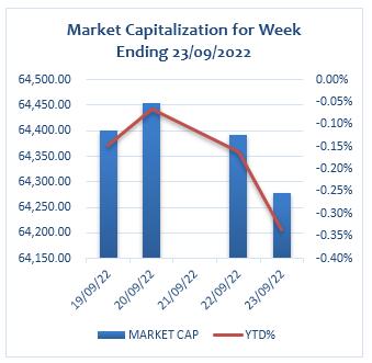 Market capitalization declined by 0.19% to close the week at GH¢64,279.00 million, from GH¢64,401.07 million at the close of the previous week. This reflects YTD decrease of 0.34%.