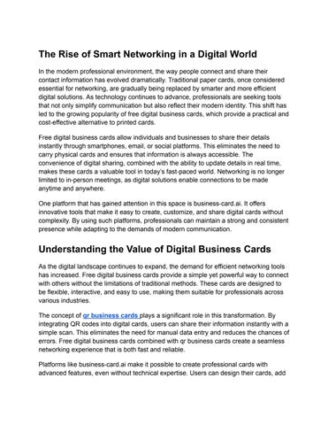 Business-Card.ai is an AI-powered platform that helps professionals and businesses create modern digital business cards in seconds. It transforms traditional networking into a smart, digital experience with shareable QR codes, wallet integration, and real-time updates. Users can easily design, customize, and manage their professional identity online. Our goal is to simplify networking, enhance first impressions, and provide a seamless way to share contact information in today’s digital-first world.