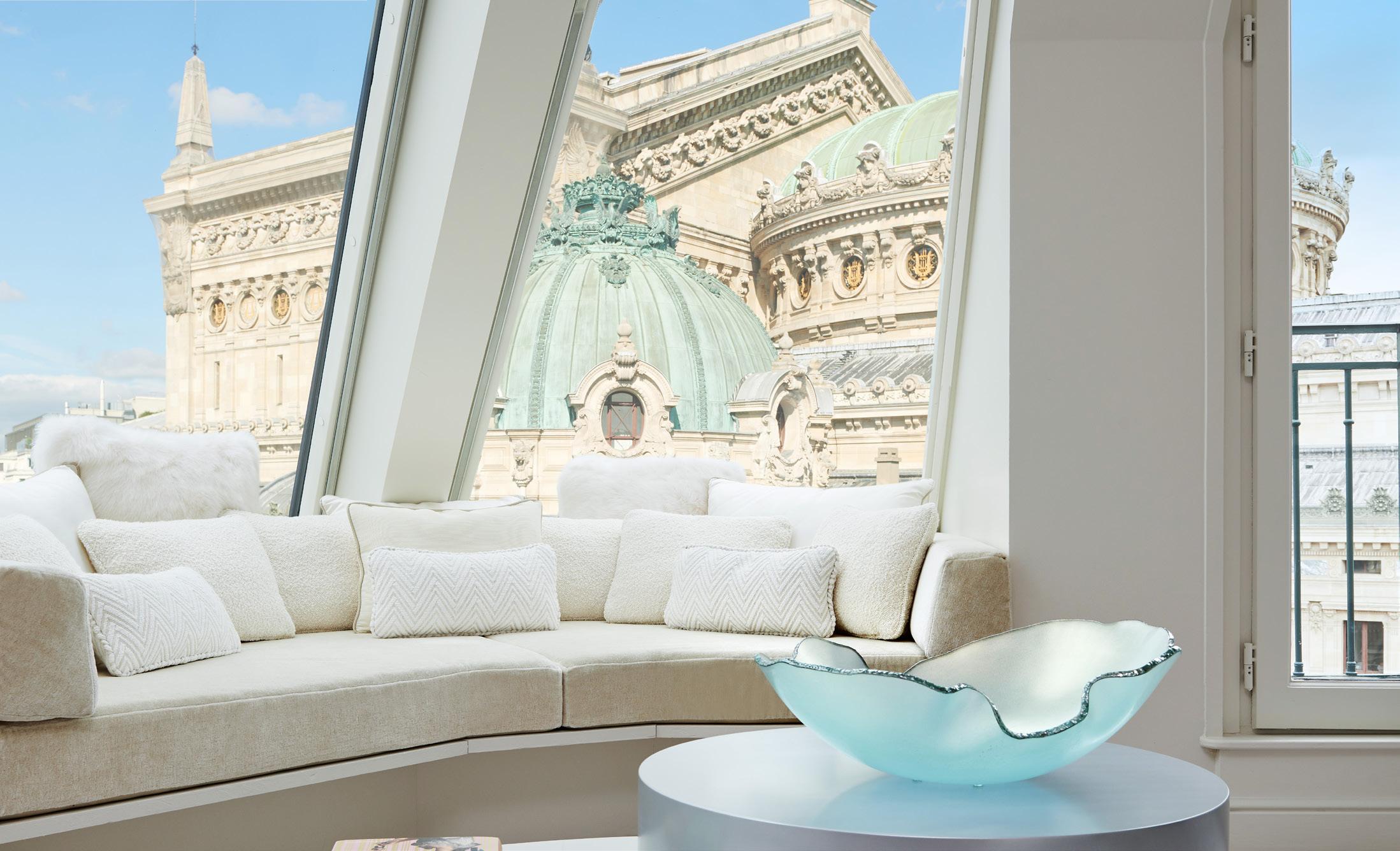 The Charles Garnier suite offers unique views of the Palais Garnier opera house with design nods to Swan Lake throughout. “It’s an elegant and romantic suite, truly remarkable,” described Christophe.