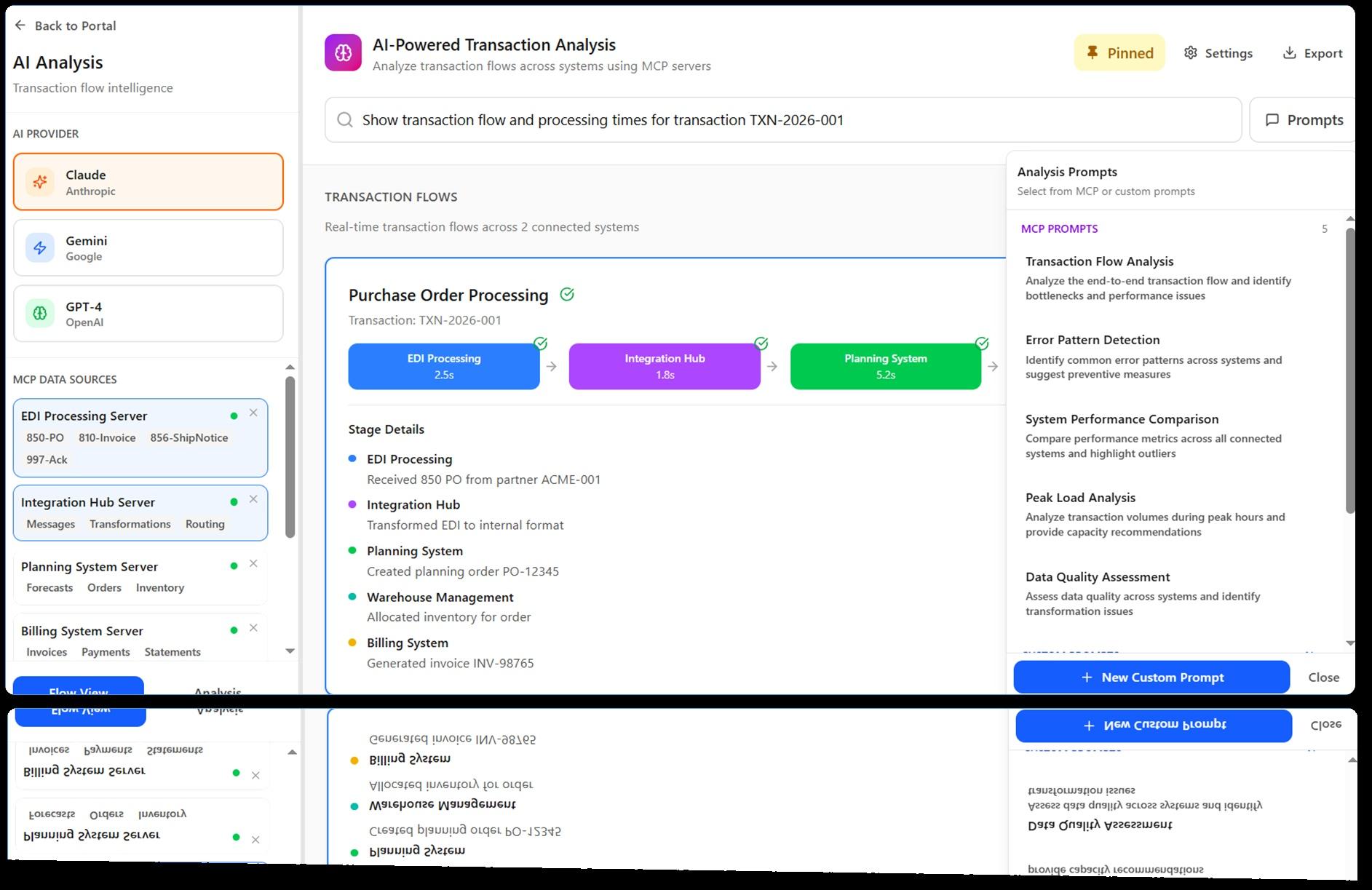 In the Platform, Behaim’s MCP servers deliver End to End Visibility (see screenshot) across the EDI, MFT, and / or Integration Business Flows to give customers a complete picture of their business transactions.