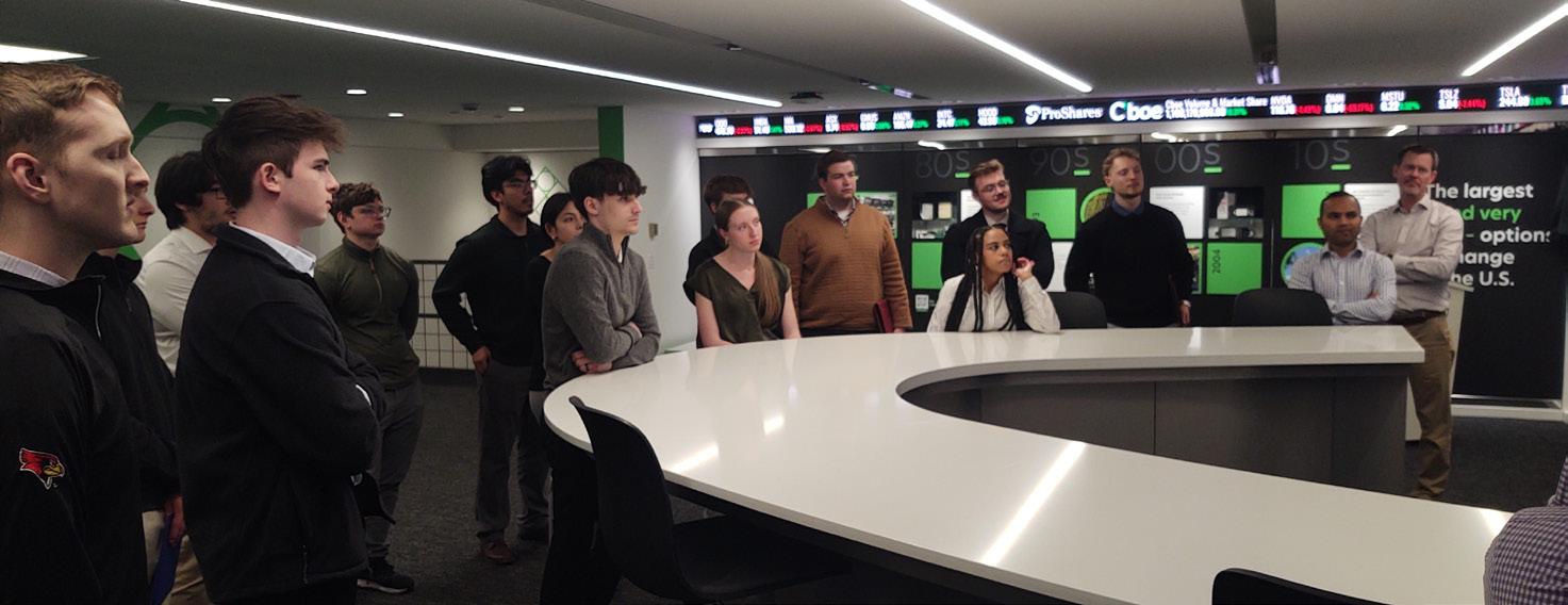 ISSF had the opportunity to take students on two exciting field trips recently. In November 2024, students visited the St. Louis Federal Reserve. The trip included a tour of the museum and discussions with multiple Fed employees, including the CFO, an economist, and recruiter. In March 2025, ISSF students took a tour of the trading floor at Cboe, a museum tour at the Chicago Federal Reserve, and met alumni Kara Hagen, Mark Brodeur, and Shane Skinner. Special thanks to Shane for organizing the Cboe tour!