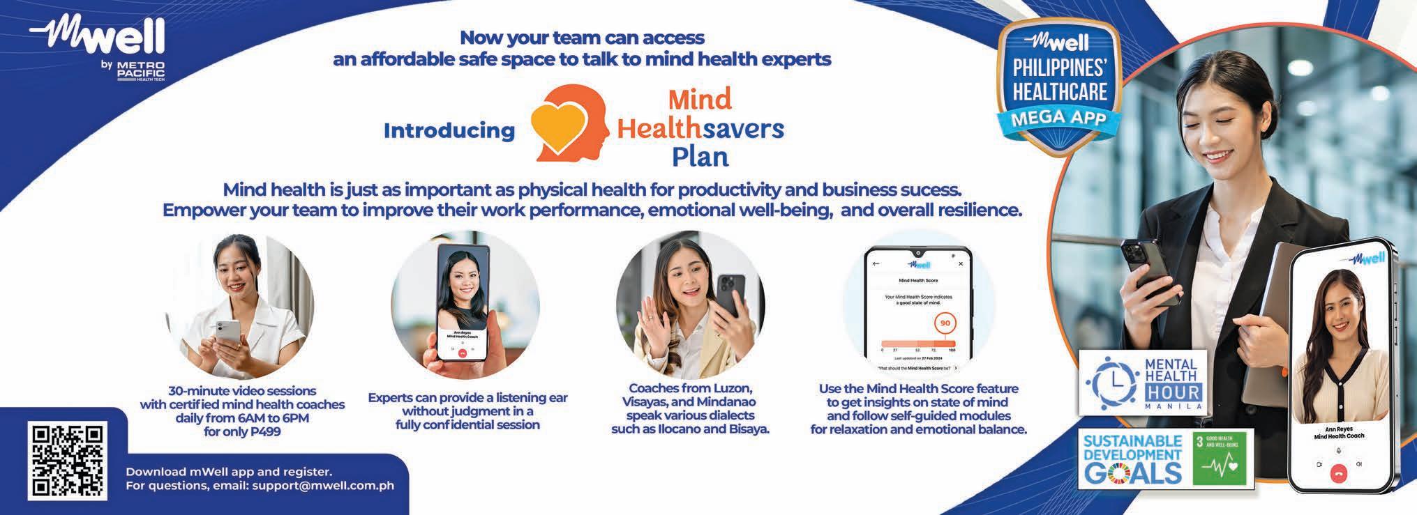 IN response to mental health issues affecting millions of Filipinos, mWell, the digital healthcare arm of Metro Pacific Investments Corporation, further strengthens its holistic health and wellness platform with affordable mind health services. Following the launch of the Mind Health Score and self-guided modules in May, mWell now offers sessions with certified mind health coaches for as low as P499. As the only Philippine health and wellness app available globally, mWell provides mind health support to students, members of the workforce, and Overseas Filipino Workers.