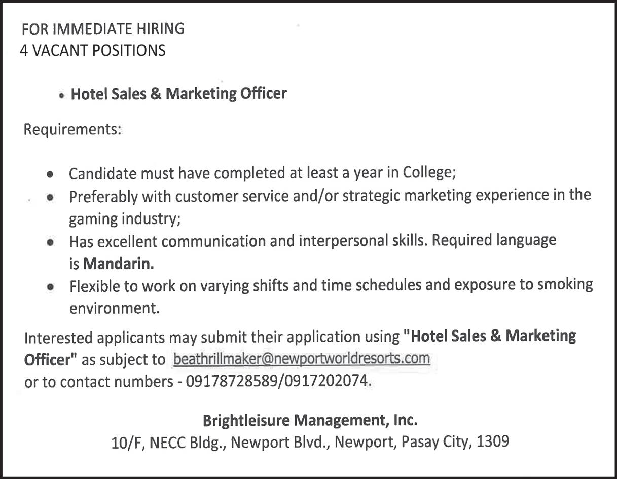 ESTABLISHMENT / ADDRESS No. NAME OF FOREIGN NATIONAL , POSITION AND BRIEF DESCRIPTION QUALIFICATION AND SALARY RANGE ESTABLISHMENT / ADDRESS No. NAME OF FOREIGN NATIONAL POSITION AND BRIEF DESCRIPTION QUALIFICATION AND SALARY RANGE ESTABLISHMENT / ADDRESS No. NAME OF FOREIGN NATIONAL , POSITION AND BRIEF DESCRIPTION QUALIFICATION AND SALARY RANGE 29. CHEN, WEIJIE Chinese Customer Service Brief Job Description: Customer support and data base services. Basic Qualification: Knowledgeable in computer applications with good verbal and written communication skills. Salary Range: Php 30,000 - Php 59,999 30. CUI, HONGHE Chinese Customer Service Brief Job Description: Customer support and data base services. Basic Qualification: Knowledgeable in computer applications with good verbal and written communication skills. Salary Range: Php 30,000 - Php 59,999 31. GUAN, QINGFENG Chinese Customer Service Brief Job Description: Customer support and data base services. Basic Qualification: Knowledgeable in computer applications with good verbal and written communication skills. Salary Range: Php 30,000 - Php 59,999 32. HU, CHENG Chinese Customer Service Brief Job Description: Customer support and data base services. Basic Qualification: Knowledgeable in computer applications with good verbal and written communication skills. Salary Range: Php 30,000 - Php 59,999 33. JU, HAOJIE Chinese Customer Service Brief Job Description: Manage incoming calls and inquiries, handling complaints, provide solutions, process customer accounts and file documents. Basic Qualification: College graduate, preferably 1 yr. of work experience in similar field, and speak and write fluently in their native language. Salary Range: Php 30,000 - Php 59,999 34. MA, ZHAO Chinese Customer Service Brief Job Description: Customer support and data base services. Basic Qualification: Knowledgeable in computer applications with good verbal and written communication skills. Salary Range: Php 30,000 - Php 59,999 35. SU, MINGHUI Chinese Customer Service Brief Job Description: Manage incoming calls and inquiries, handling complaints, provide solutions, process customer accounts and file documents. Basic Qualification: College graduate, preferably 1 yr. of work experience in similar field, and speak and write fluently in their native language. Salary Range: Php 30,000 - Php 59,999 36. WANG, JIYUE Chinese Customer Service Brief Job Description: Manage incoming calls and inquiries, handling complaints, provide solutions, process customer accounts and file documents. Basic Qualification: College graduate, preferably 1 yr. of work experience in similar field, and speak and write fluently in their native language. Salary Range: Php 30,000 - Php 59,999 37. WANG, LIANGDE Chinese Customer Service Brief Job Description: Customer support and data base services. Basic Qualification: Knowledgeable in computer applications with good verbal and written communication skills. Salary Range: Php 30,000 - Php 59,999 38. WANG, QING Chinese Customer Service Brief Job Description: Customer support and data base services. Basic Qualification: Knowledgeable in computer applications with good verbal and written communication skills. Salary Range: Php 30,000 - Php 59,999 39. WEI, YANYUN Chinese Customer Service Brief Job Description: Customer support and data base services. Basic Qualification: Knowledgeable in computer applications with good verbal and written communication skills. Salary Range: Php 30,000 - Php 59,999 40. WEN, WEILIANG Chinese Customer Service Brief Job Description: Manage incoming calls and inquiries, handling complaints, provide solutions, process customer accounts and file documents. Basic Qualification: College graduate, preferably 1 yr. of work experience in similar field, and speak and write fluently in their native language. Salary Range: Php 30,000 - Php 59,999 41. XIAO, BO Chinese Customer Service Brief Job Description: Customer support and data base services. Basic Qualification: Knowledgeable in computer applications with good verbal and written communication skills. Salary Range: Php 30,000 - Php 59,999 42. XU, DINGWEN Chinese Customer Service Brief Job Description: Customer support and data base services. Basic Qualification: Knowledgeable in computer applications with good verbal and written communication skills. Salary Range: Php 30,000 - Php 59,999 43. YANG, XINGTIAN Chinese Customer Service Brief Job Description: Manage incoming calls and inquiries, handling complaints, provide solutions, process customer accounts and file documents. Basic Qualification: College graduate, preferably 1 yr. of work experience in similar field, and speak and write fluently in their native language. Salary Range: Php 30,000 - Php 59,999 44. YE, XIAORONG Chinese Customer Service Brief Job Description: Customer support and data base services. Basic Qualification: Knowledgeable in computer applications with good verbal and written communication skills. Salary Range: Php 30,000 - Php 59,999 45. ZHAO, JING Chinese Customer Service Brief Job Description: Customer support and data base services. Basic Qualification: Knowledgeable in computer applications with good verbal and written communication skills. Salary Range: Php 30,000 - Php 59,999 46. SAKIB, FAHIM SAHREAR Customer Service Representative Brief Job Description: Manage incoming calls and inquiries, handling complaints, provide solutions, process customer accounts and file documents. Basic Qualification: College graduate, preferably 1 yr. of work experience in similar field, and speak and write fluently in their native language. Salary Range: Php 30,000 - Php 59,999 47. SANTANA DOS SANTOS, ARNALDO Customer Service Representative Brief Job Description: Manage incoming calls and inquiries, handling complaints, provide solutions, process customer accounts and file documents. Basic Qualification: College graduate, preferably 1 yr. of work experience in similar field, and speak and write fluently in their native 