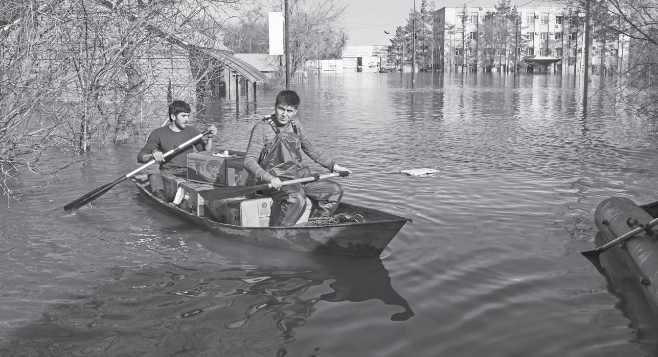 TWO men ride a boat delivering food in a flooded area in Orenburg, Russia on Thursday, April 11, 2024. Russian officials are scrambling to help homeowners displaced by floods, as water levels have risen in the Ural River. The river’s water level in the city of Orenburg was above 10 meters (33 feet) Wednesday, state news agency Ria Novosti reported, citing the regional governor. AP