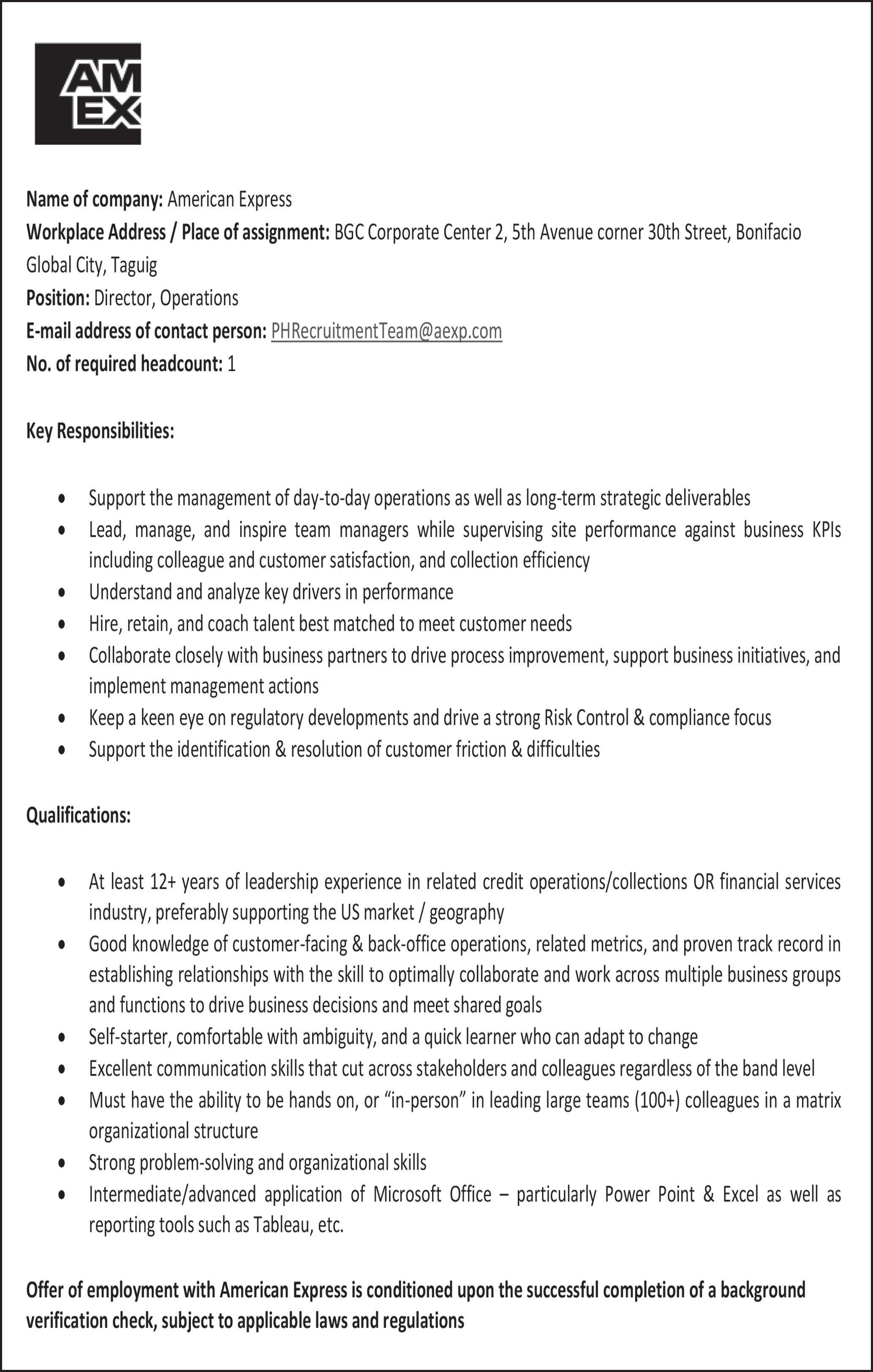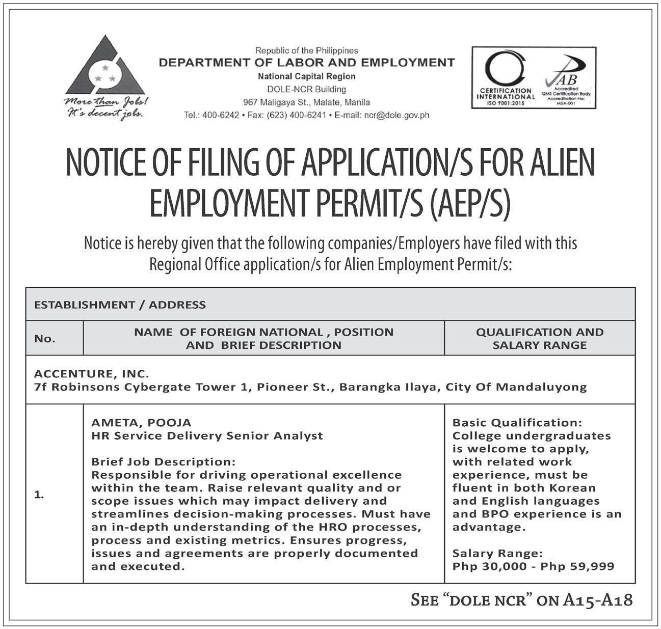 ESTABLISHMENT / ADDRESS No. NAME OF FOREIGN NATIONAL , POSITION AND BRIEF DESCRIPTION QUALIFICATION AND SALARY RANGE ESTABLISHMENT / ADDRESS No. NAME OF FOREIGN NATIONAL , POSITION AND BRIEF DESCRIPTION QUALIFICATION AND SALARY RANGE ESTABLISHMENT / ADDRESS No. NAME OF FOREIGN NATIONAL POSITION AND BRIEF DESCRIPTION QUALIFICATION AND SALARY RANGE ACCENTURE, INC. 7f Robinsons Cybergate Tower 1, Pioneer St., Barangka Ilaya, City Of Mandaluyong 1. AMETA, POOJA HR Service Delivery Senior Analyst Brief Job Description: Responsible for driving operational excellence within the team. Raise relevant quality and or scope issues which may impact delivery and streamlines decision-making processes. Must have an in-depth understanding of the HRO processes, process and existing metrics. Ensures progress, issues and agreements are properly documented and executed. Basic Qualification: College undergraduates is welcome to apply, with related work experience, must be fluent in both Korean and English languages and BPO experience is an advantage. Salary Range: Php 30,000 - Php 59,999 2. NGOIE, PAHOLA MUKALAYI SW/App/Cloud Tech Support Analyst Brief Job Description: The position will require candidates to take calls using any of the 6 languages to support our clients with their IT-related incidents and request. Some of the roles and responsibilities for the role include perform initial triage for IT issues raised by customer’s log, track, and update incidents. Basic Qualification: Graduate of any 4 yr. course, preferably IT or Engineering related. Strong working knowledge level on multiple IT technologies. Excellent communication skills both written and verbal. Salary Range: Php 30,000 - Php 59,999 ALTERA KARNA BUSINESS CORP. 5th, 6th, 7th Flrs. Eighty-one Newport Blvd., Newport City St., Barangay 183, Pasay City 3. CHEN, DAIDI Customer Service Representative (Chinese Speaking) Brief Job Description: Provide customer service to clients. Basic Qualification: Any nationality who can speak and write in Chinese language fluently. Detail-oriented and has the ability to multi-task. Preferably 6 months to 1-year customer service experience. Salary Range: Php 30,000 - Php 59,999 4. HSU, CHEN-SHAN Customer Service Representative (Chinese Speaking) Brief Job Description: Provide customer service to clients. Basic Qualification: Any nationality who can speak and write in Chinese language fluently. Detail-oriented and has the ability to multi-task. Preferably 6 months to 1-year customer service experience. Salary Range: Php 30,000 - Php 59,999 5. LE NA Customer Service Representative (Chinese Speaking) Brief Job Description: Provide customer service to clients. Basic Qualification: Any nationality who can speak and write in Chinese language fluently. Detail-oriented and has the ability to multi-task. Preferably 6 months to 1-year customer service experience. Salary Range: Php 30,000 - Php 59,999 6. WU, SHUANG Customer Service Representative (Chinese Speaking) Brief Job Description: Provide customer service to clients. Basic Qualification: Any nationality who can speak and write in Chinese language fluently. Detail-oriented and has the ability to multi-task. Preferably 6 months to 1-year customer service experience. Salary Range: Php 30,000 - Php 59,999 7. YEN, HUNG-DA Customer Service Representative (Chinese Speaking) Brief Job Description: Provide customer service to clients. Basic Qualification: Any nationality who can speak and write in Chinese language fluently. Detail-oriented and has the ability to multi-task. Preferably 6 months to 1-year customer service experience. Salary Range: Php 30,000 - Php 59,999 AVANTICE CORPORATION 19/f Pbcom Tower, Ayala Ave., Bel-air, City Of Makati 8. MALIK, RITIK Client Delivery Executive Brief Job Description: Conduct and analyze market research. Basic Qualification: Must be native Malaysian/Taiwanese/ Korean/Indian/Thai/ Japanese/ Indonesian/ Singaporean/ Vietnamese/ Chinese. Fluent in English and respective native language. With at least 2 years of experience in similar field. Salary Range: Php 90,000 - Php 149,999 9. VU NGUYEN Client Delivery Executive Brief Job Description: Conduct and analyze market research. Basic Qualification: Must be native Malaysian/Taiwanese/ Korean/Indian/Thai/ Japanese/ Indonesian/ Singaporean/ Vietnamese/ Chinese. Fluent in English and respective native language. With at least 2 years of experience in similar field. Salary Range: Php 90,000 - Php 149,999 BRIGHT LUME IT SOLUTIONS INC. Unit 202 Erisha Condominium, 1142 P Ocampo Street, Barangay 757, Santa Ana, City Of Manila 10. SON, CHOUNGJIN Senior IT Business Analyst Brief Job Description: Communicate with client’s technology and business departments to gain understanding of their current systems and networks. Work with the development team to design the appropriate solution. Basic Qualification: Bachelor’s degree holder with experience in business management, product and research development, computer/ software training, marketing/sales, or related field and fluent in both written and verbal English and ChineseMandarin languages. Salary Range: Php 30,000 - Php 59,999 EXLSERVICE PHILIPPINES, INC. 6th Floor, One E-com Center, Harbor Drive, Mall Of Asia Complex, Pasay City 11. RAJAGOPALAN, MAHESH Vice President - Quality Excellence Brief Job Description: Oversee the quality & process excellence team in driving improvements projects and to assist the operations team in achieving their production goals. Basic Qualification: Management professional with extensive crosscultural experience of more than 20 years in quality operations and project management. Salary Range: Php 150,000 - Php 499,999 GAO SHOU TECHNOLOGY MANAGEMENT, INC. 52/f Pbcom Tower, 6795 Ayala Ave. Cor. V.a. Rufino St., Bel-air, City Of Makati 12. LU, SHENG-AN Chinese Customer Service Representative Brief Job Description: Attracts potential customers by answering product and service questions and suggesting information about other p