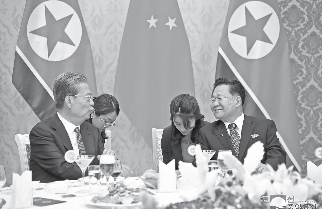 Party of North Korea, talks with Zhao Leji, left, chairman of the National People’s Congress of China during a reception at the Mansudae Assembly Hall in Pyongyang, North Korea on April 11, 2024. KOREAN CENTRAL NEWS AGENCY/KOREA NEWS SERVICE VIA AP