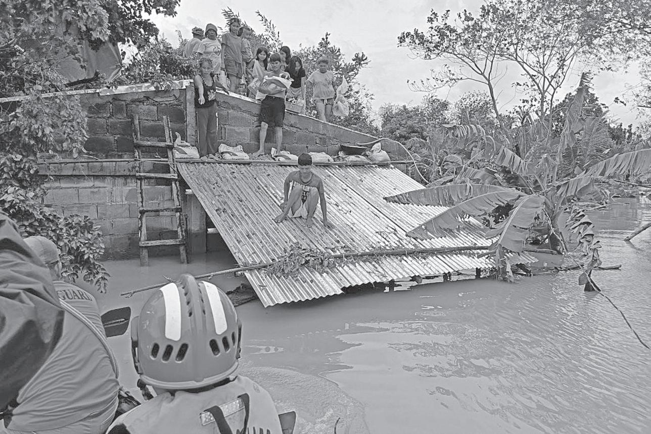 RESIDENTS staying on top of their roofs to avoid floods caused by Tropical Storm Kristine wait to be rescued at Libon, Albay, Wednesday, October 23, 2024. PHILIPPINE COAST GUARD VIA AP